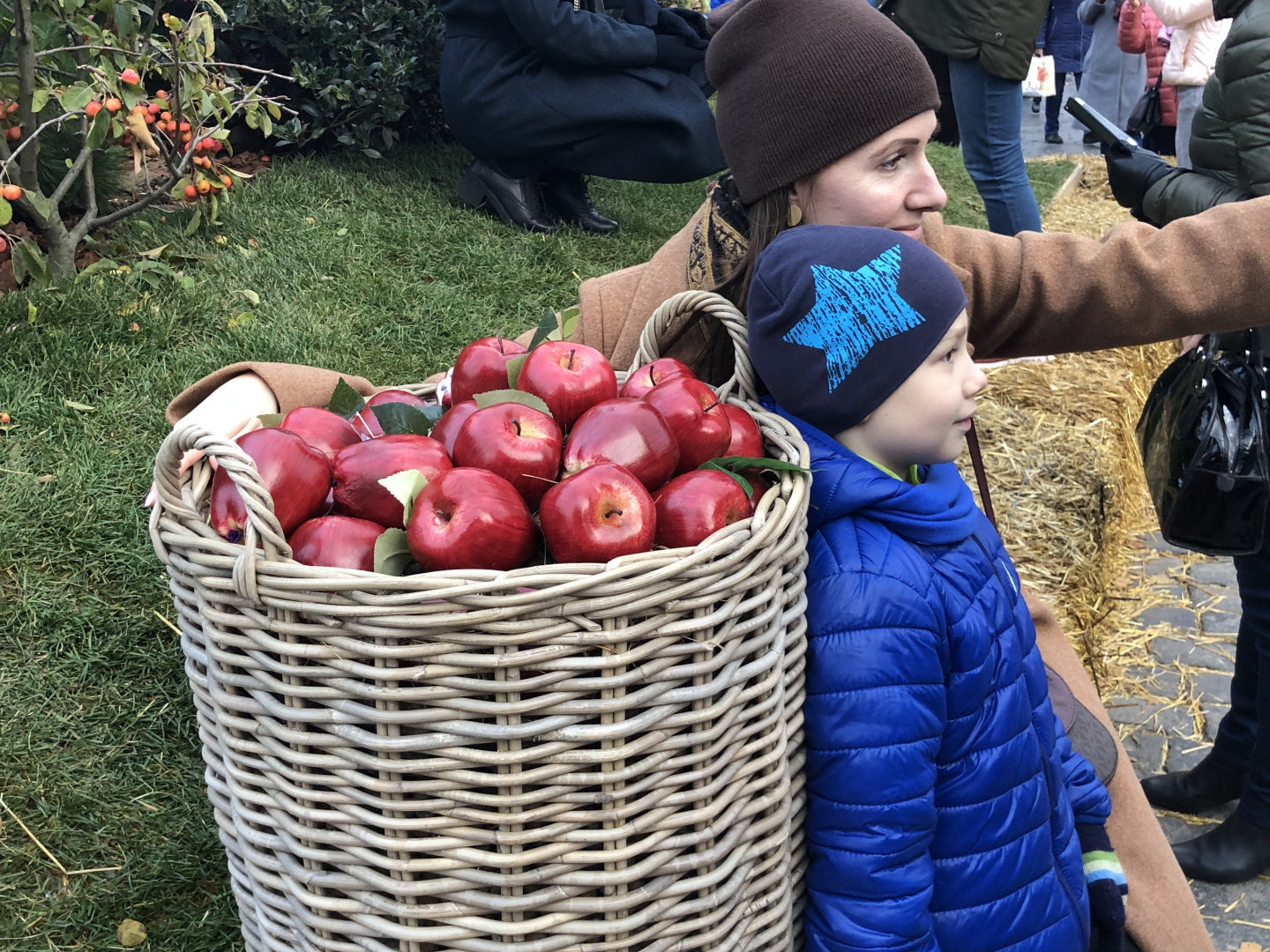 С одной стороны «росли» яблони, с другой – вился виноград, а вокруг – люди, люди, люди. Это такие фотозоны, где можно сделать красивые снимки у корзины с бутафорскими наливными яблочками. На самом деле, очень красиво.