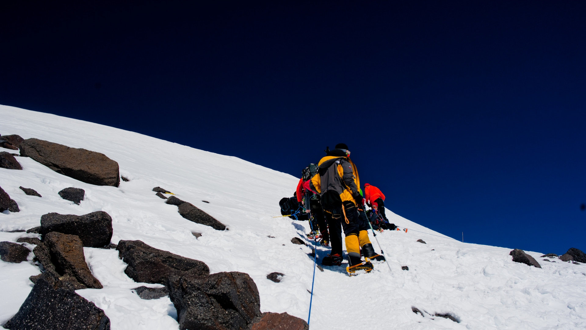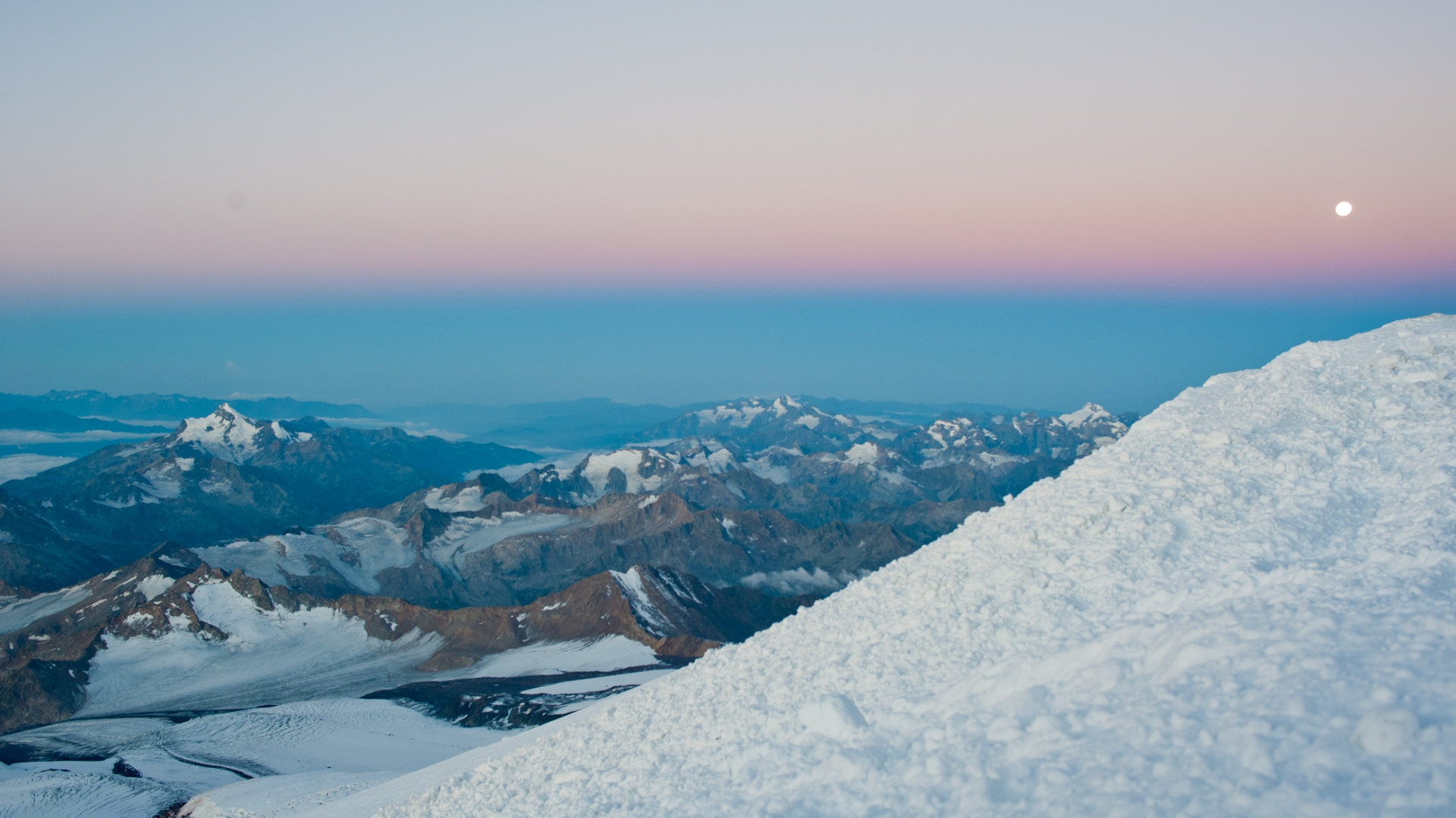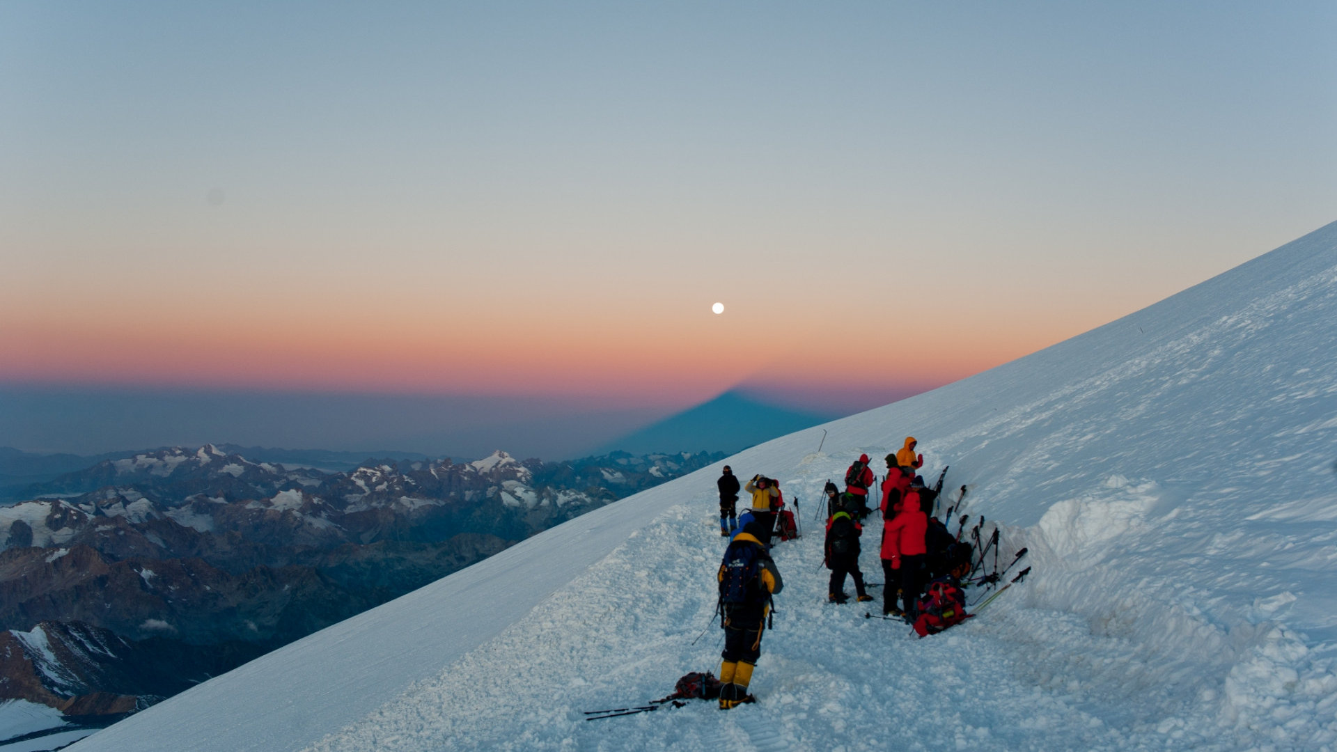 От поляны приюта до 5100 м – равномерный набор высоты, а на 5100м как раз рассвет. До туда можно доехать на ратраке (но ведь это нечестно? ) или норм?), ну а дальше начинается подъем по косой полке до седловины (5300м). Здесь меняем палки на ледоруб.