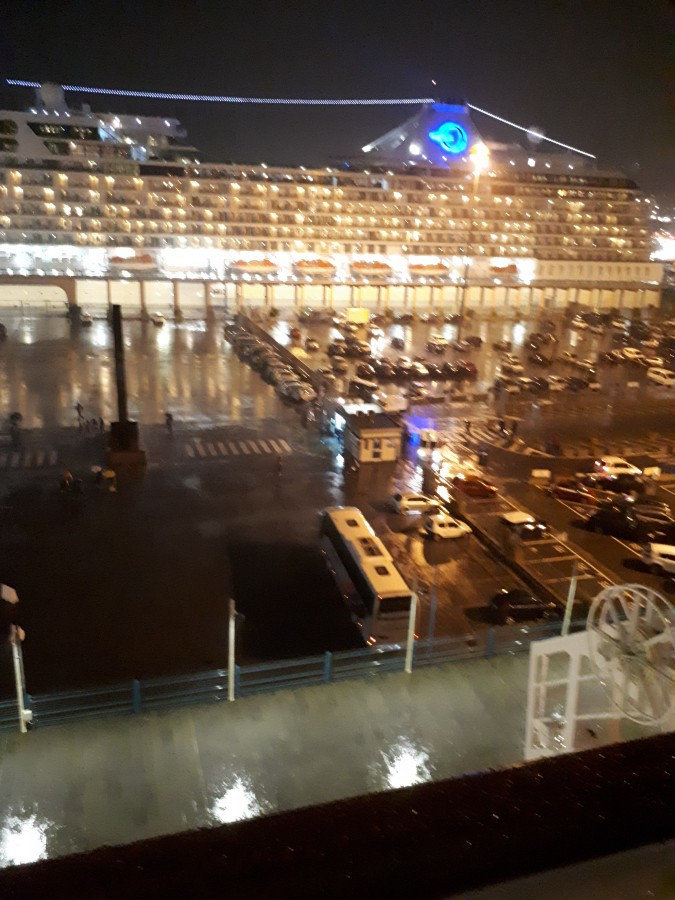 На улице хлынул ливень и мы не без некоторого удовлетворения наблюдали бегущих пассажиров, подгоняемых потоками воды и скорой посадкой. Подумали, что все сделали правильно и далее в круизе не гнались за попыткой использовать стоянку по максимуму, тем самым избежав даже маленьких очередей на выход и вход.