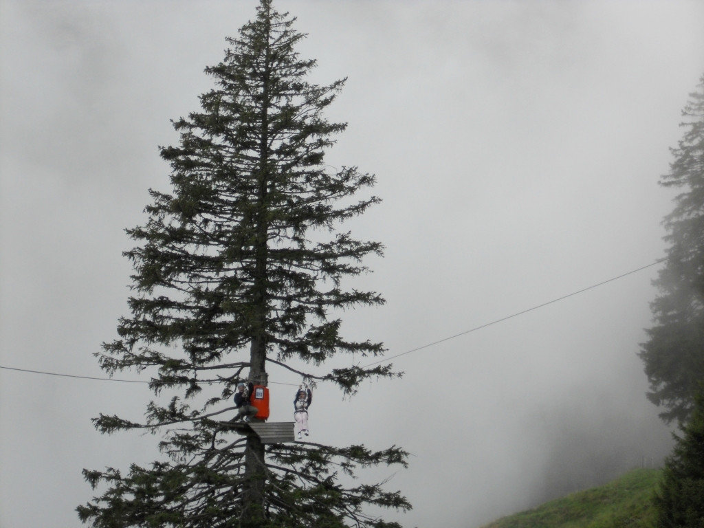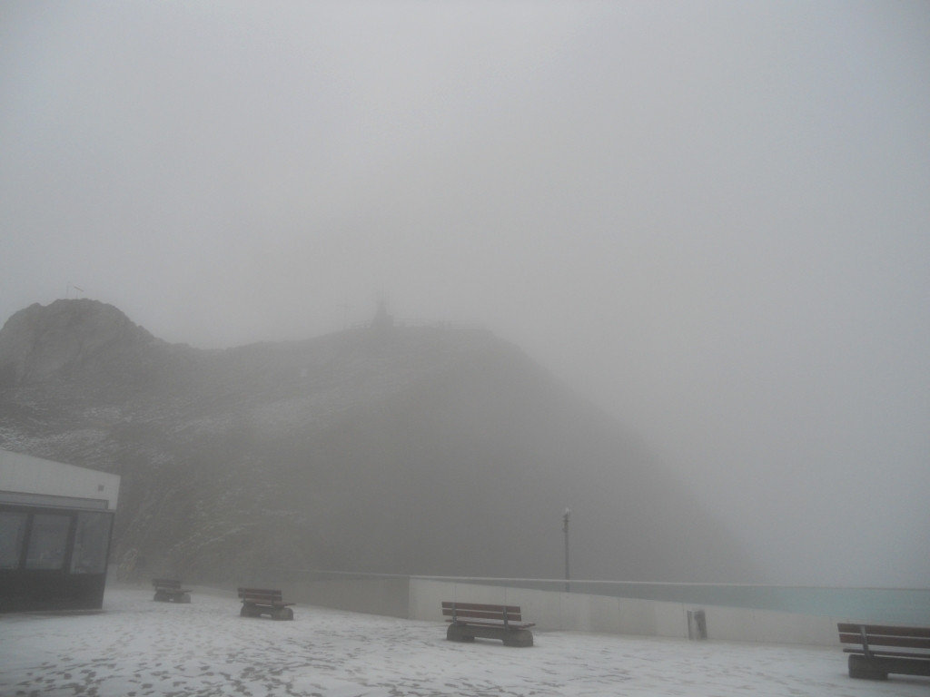 Мы поднялись на фуникулере, в закрытом вместительном вагончике, и вышли. Оказалось, что выпал первый снег. Видимость была нулевая, поэтому смысла идти в лес, гулять по горе, увы, мы не увидели – мы прогулялись вокруг отеля и спустились вниз.