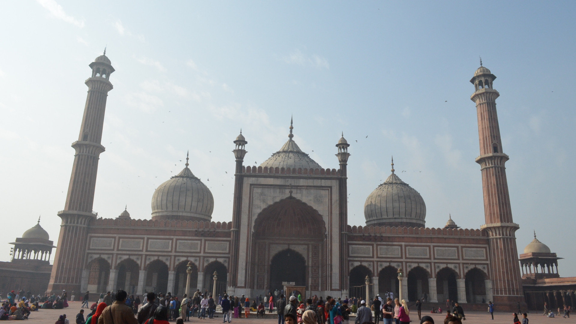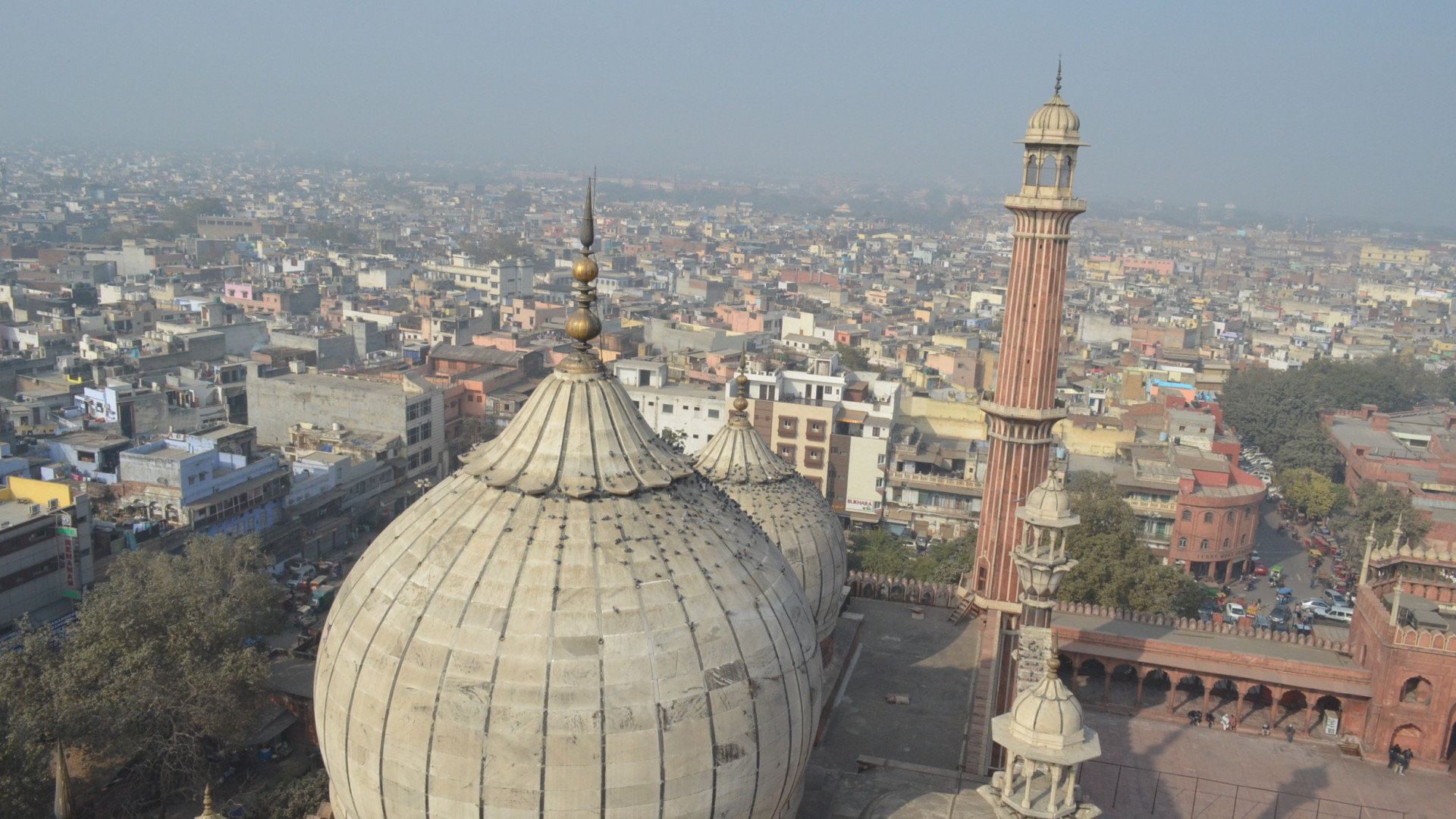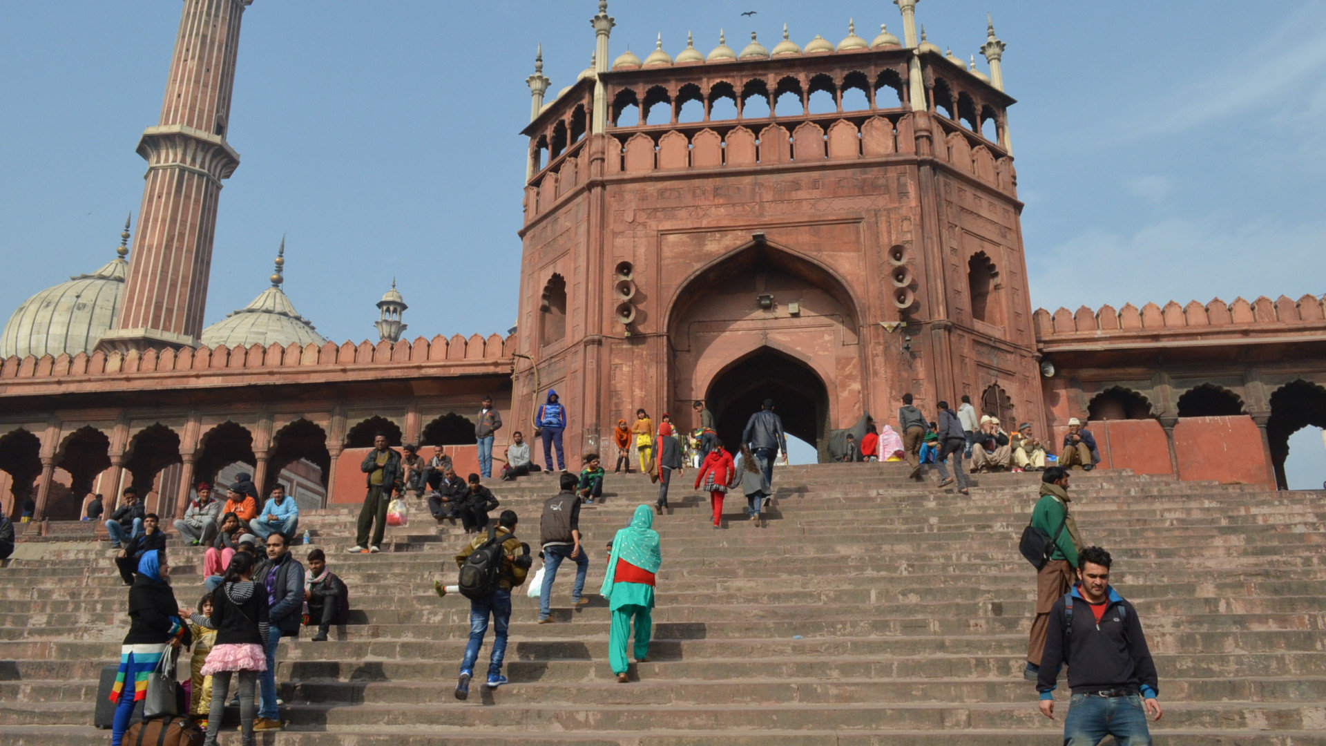 у наших попутчиков носков не оказалось, и они отправились на соседний рынок, благо он располагался непосредственно за забором мечети, к слову свои белые носки я впоследствии выбросил. Территория мечети представляет собой квадрат с квадратным же фонтаном посередине, кстати не работающим. В общем ничем особо не примечательное место если бы не возможность подняться на главный минарет и обозреть окрестности Дели с высоты птичьего полета, что мы и сделали.