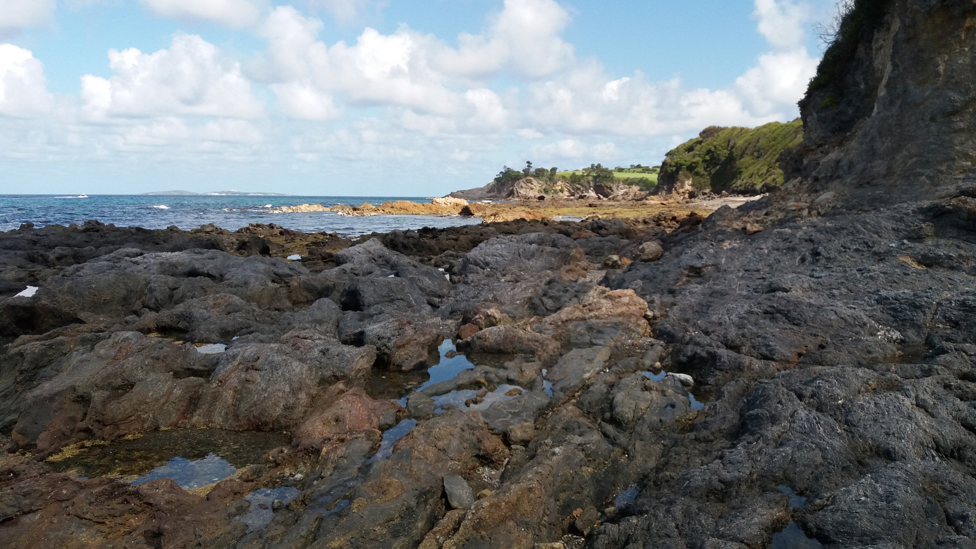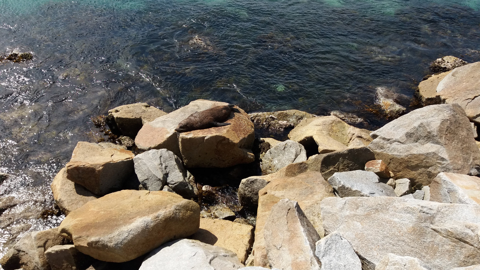 Не спеша пообедав, мы отправились дальше. Поиск Google выдал замечательно место для прогулок и любования видами, так мы доехали до города Narooma (Нарума). Название этого места происходит от аборигенов и означает что-то вроде «прозрачные голубые воды». В Наруме есть смотровые площадки, с которых открывается прекрасные виды на город и океан. Одна из интересных «достопримечательностей» Нарумы является Australia Rock, небольшая скала, отверстие в которой по своим очертаниям напоминает силуэт австралийского континента. Форма это получилась чисто случайно в процессе того, как много лет назад к этой скале судна крепили якорные цепи, чтобы их не унесло в море. Цепи из-за качки волн терлись о стены скалы, вот таким образом и получился на удивление всем силуэт Австралии. Там же были встречены «коренные» обитатели, морские котики, нежившиеся на теплых камнях.