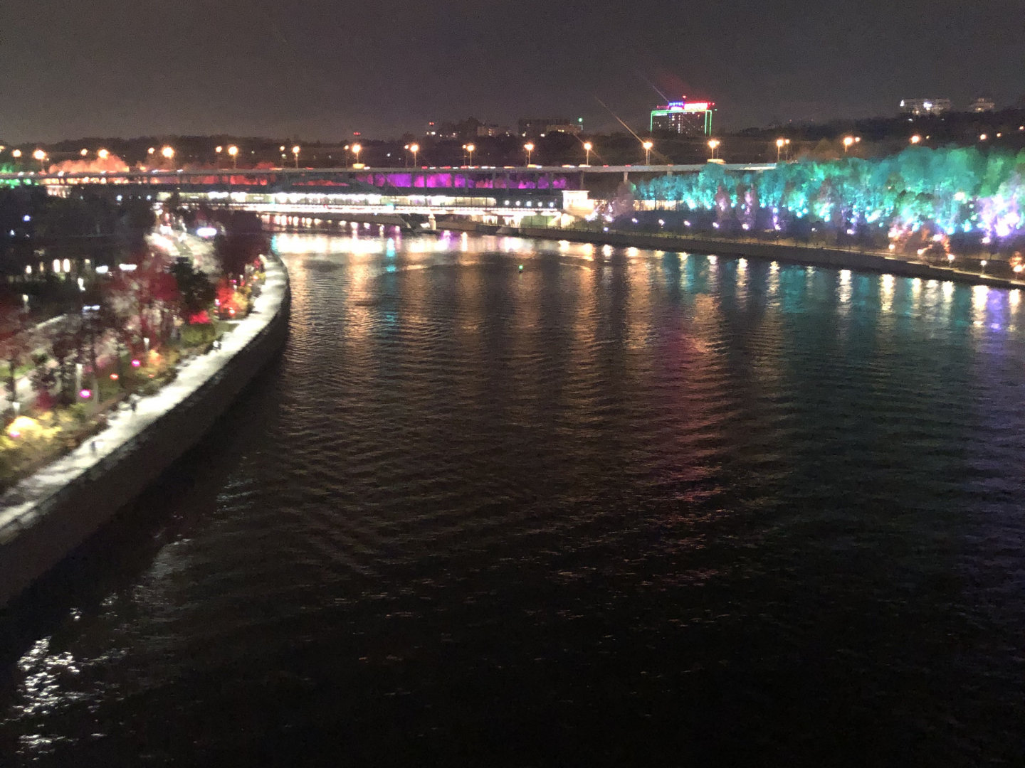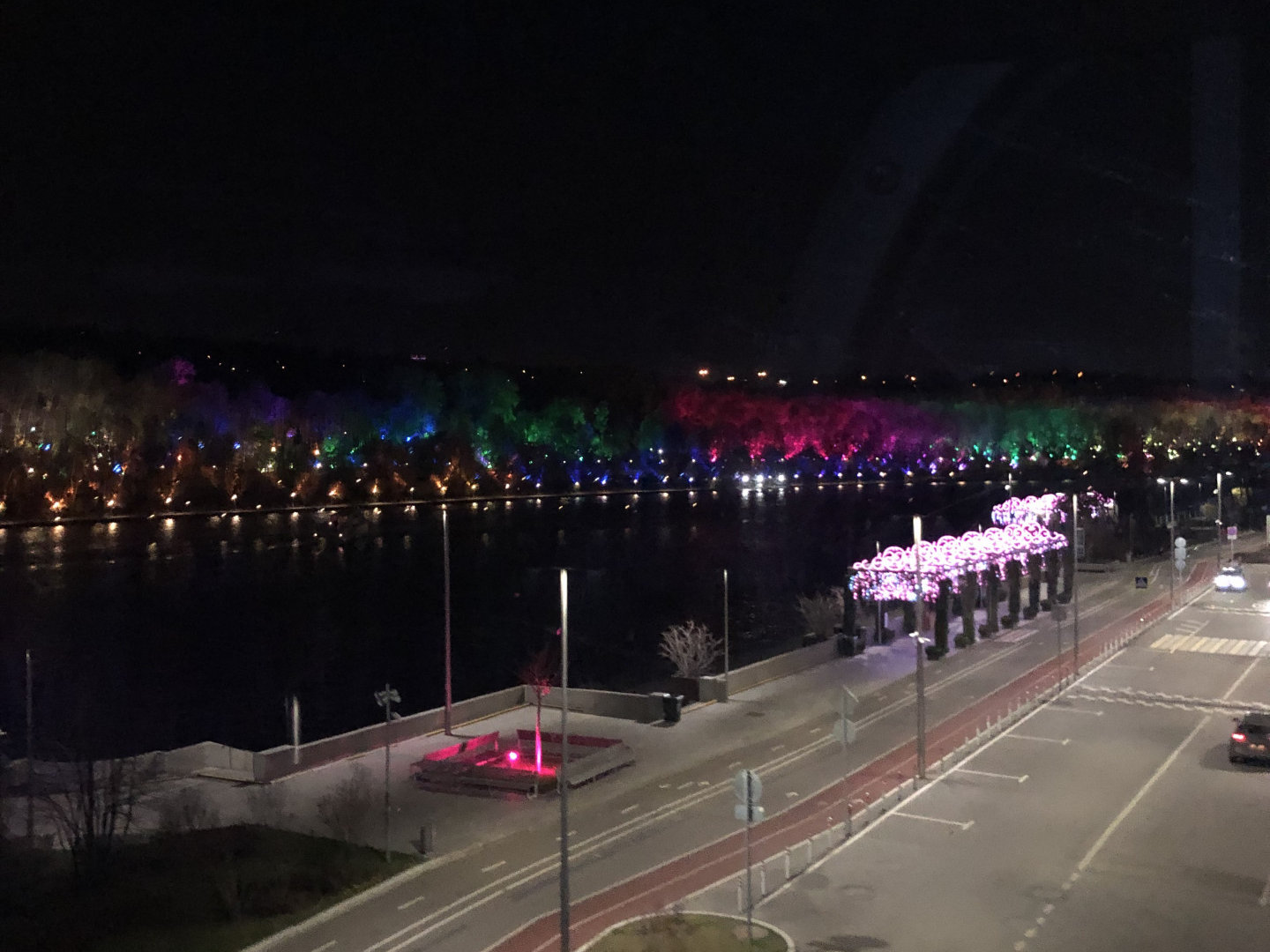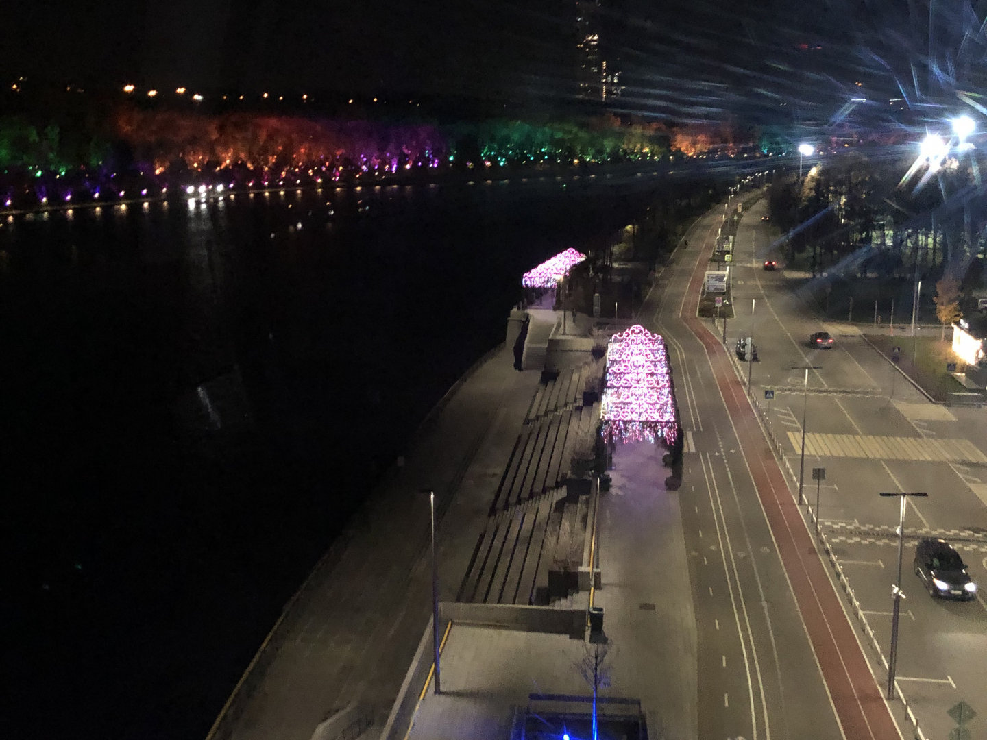 Деревья по берегу реки не просто освещены – яркие краски разливаются вдоль воды, отражаясь в ней и придавая объем и расширяя пространство. Цвет льется отовсюду – находясь на противоположном от Воробьевых гор берегу, мы смогли увидеть полную картину освещенного леса и оценить задумку дизайнеров-оформителей. Повторюсь, фантастические ощущения!