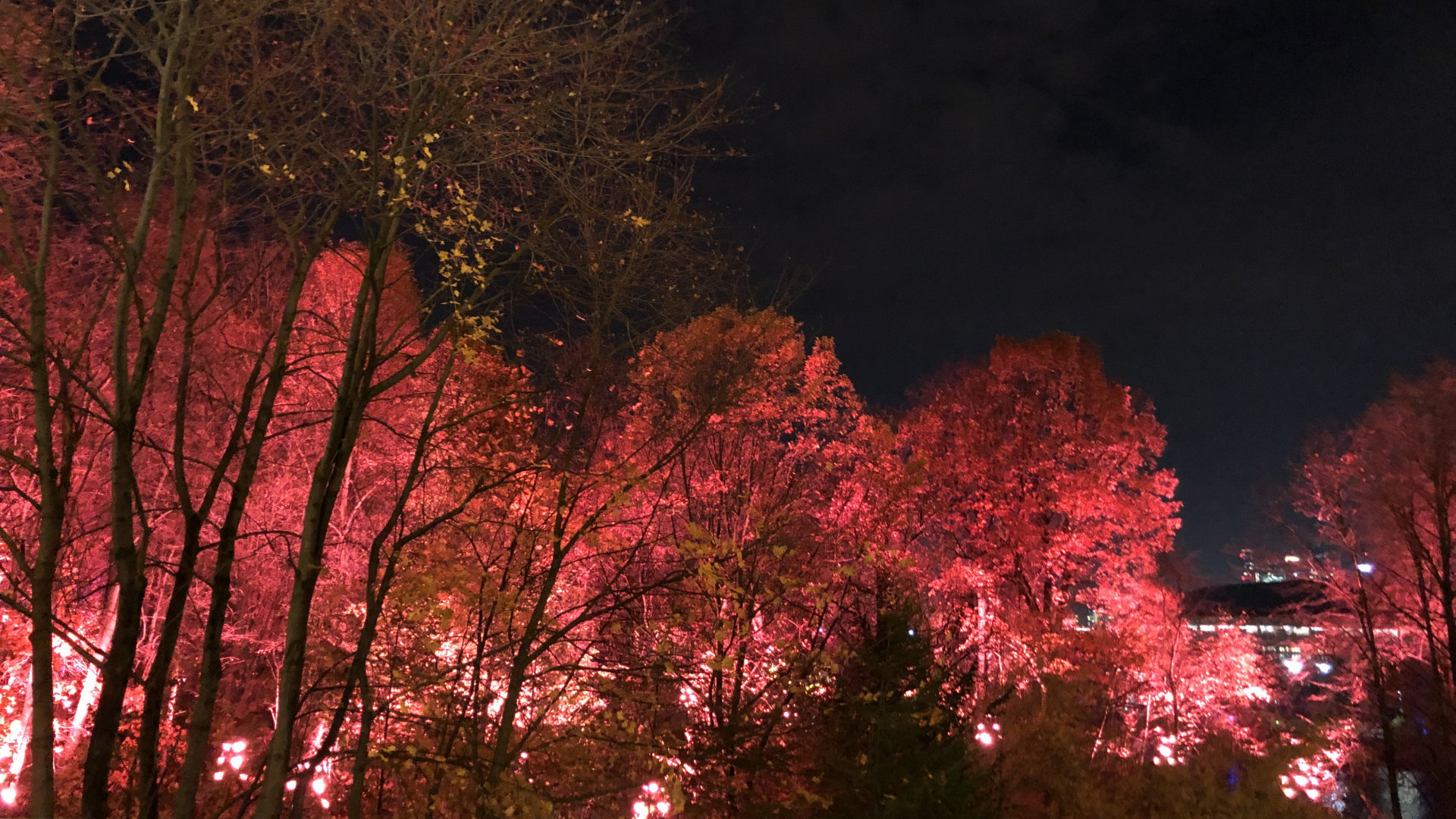 После этого, спустившись в парк, мы оказались очень близко к источникам света — нас обдало яркостью и жаром цвета от деревьев. Сменяются цвета очень быстро — сейчас это ярко-розовый, а через секунду — уже мягко-зеленый: