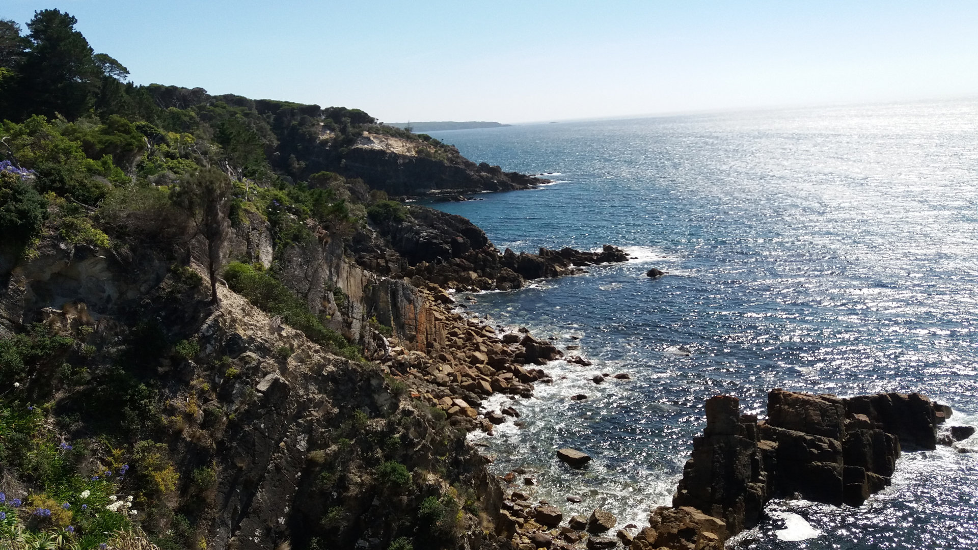 Добравшись до смотровой площадки нашему взору впервые предстало Сапфировое побережье во всей красе. Раньше не доводилось видеть край континента с такого ракурса, разве что в Etretat во Франции, но там более отвесное и скудное на краски побережье. Тут же находиться небольшой мемориал рыбакам и морякам погибшим в море при разных обстоятельствах. Есть небольшой парк, Парк Иден Лукаут энд Ротари (Eden Lookout and Rotary Park), и прогулочная тропа среди вековых хвойных деревьев.