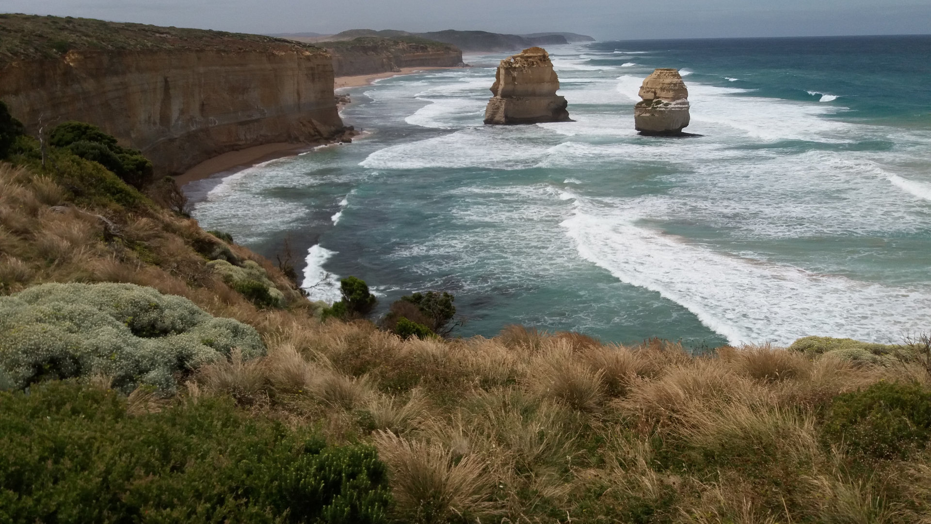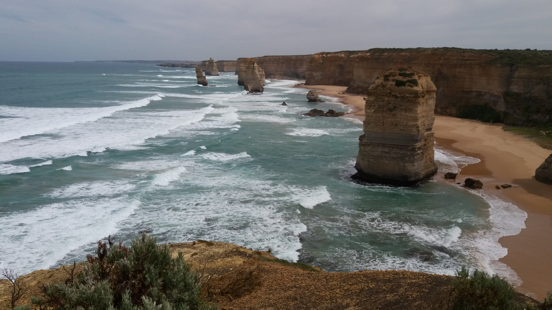 Национальный парк «Порт-Кэмпбелл» представляет из себя несколько остановок со стоянками, кафе, магазинами и смотровыми площадками, мы останавливаемся на самой посещаемой, откуда открывается вид собственно на самих «Апостолов». Нам повезло с погодой и количеством китайцев, небо было достаточно светлым, море насыщенно бирюзового цвета, песчаный берег с местной растительностью, чем-то напоминающую лишайник, все передавало атмосферу величия и умиротворенности.