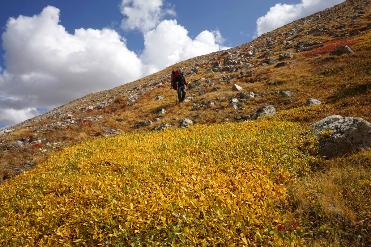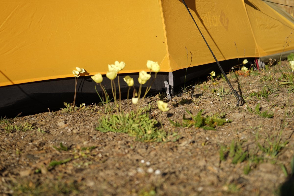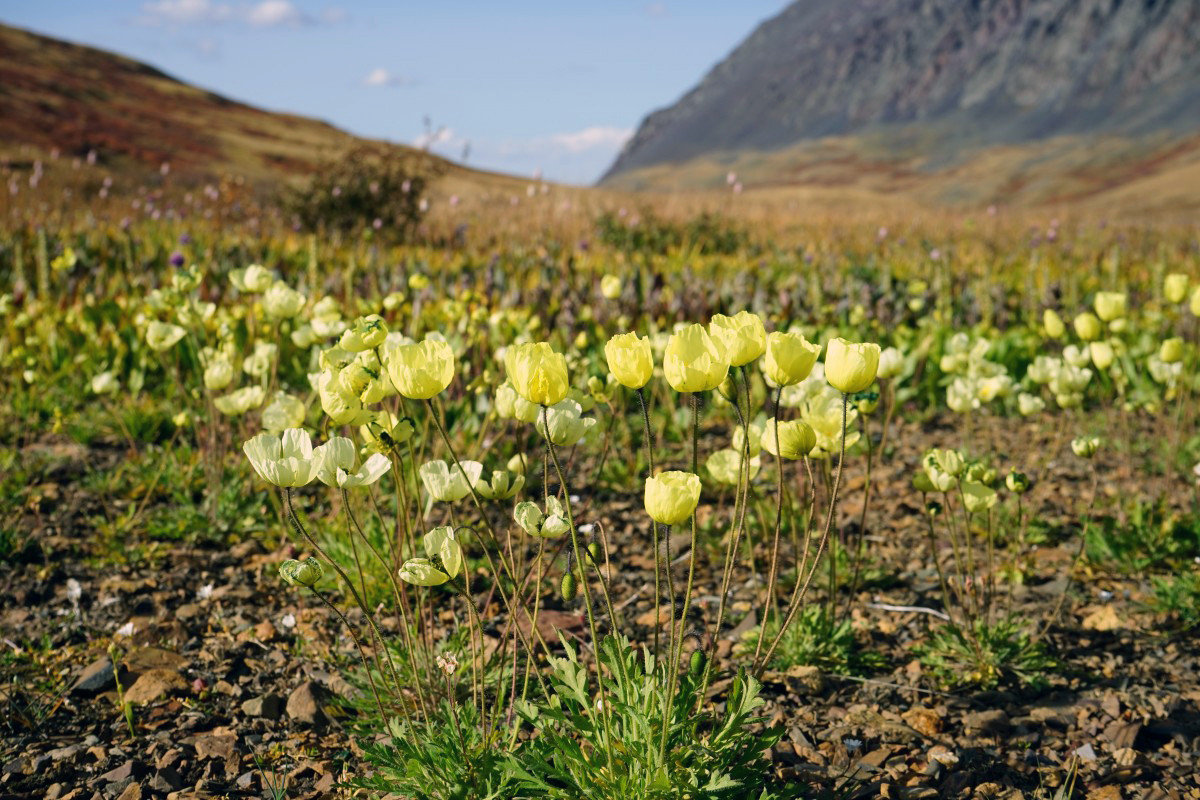 Когда спустились в долину Кара-Чад, нашли уютное местечко для стоянки с цветущими маками и диким луком. Как тут было красиво! Ребята собрались на горное озеро искупаться, а я, конечно же пошла с целью пофотать осень!