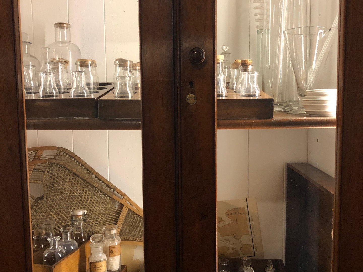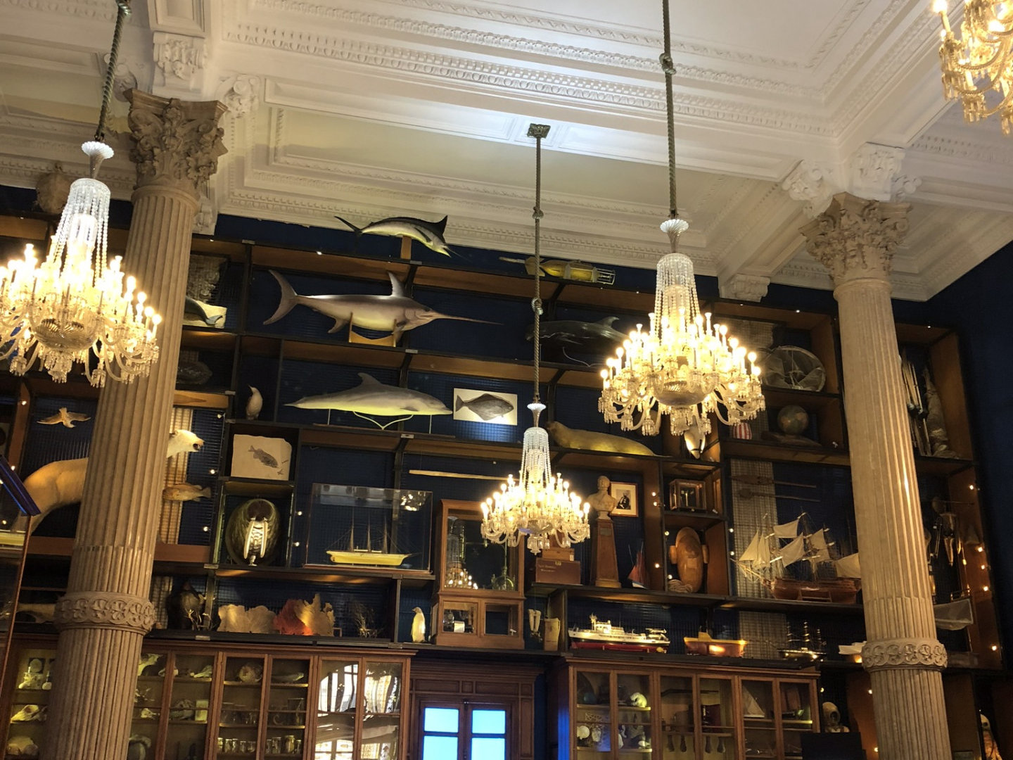 Внутри деревянные панели, прозрачные шкафы, книги, коллекции раковин, инструменты, карты.