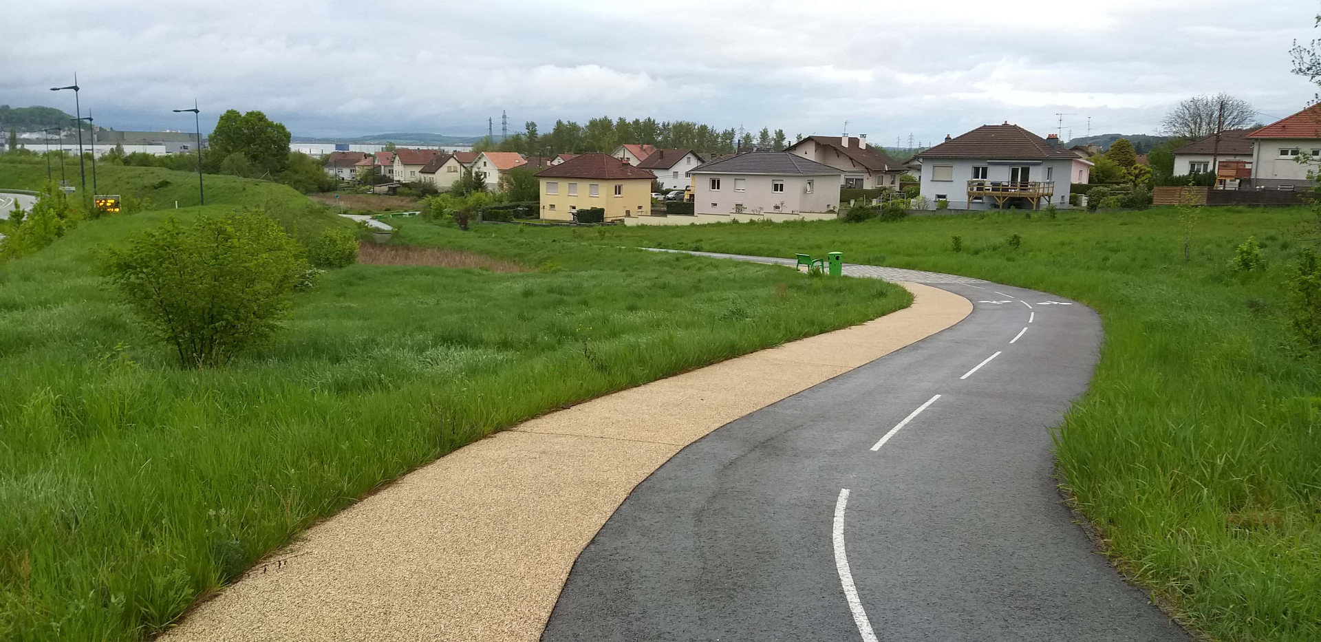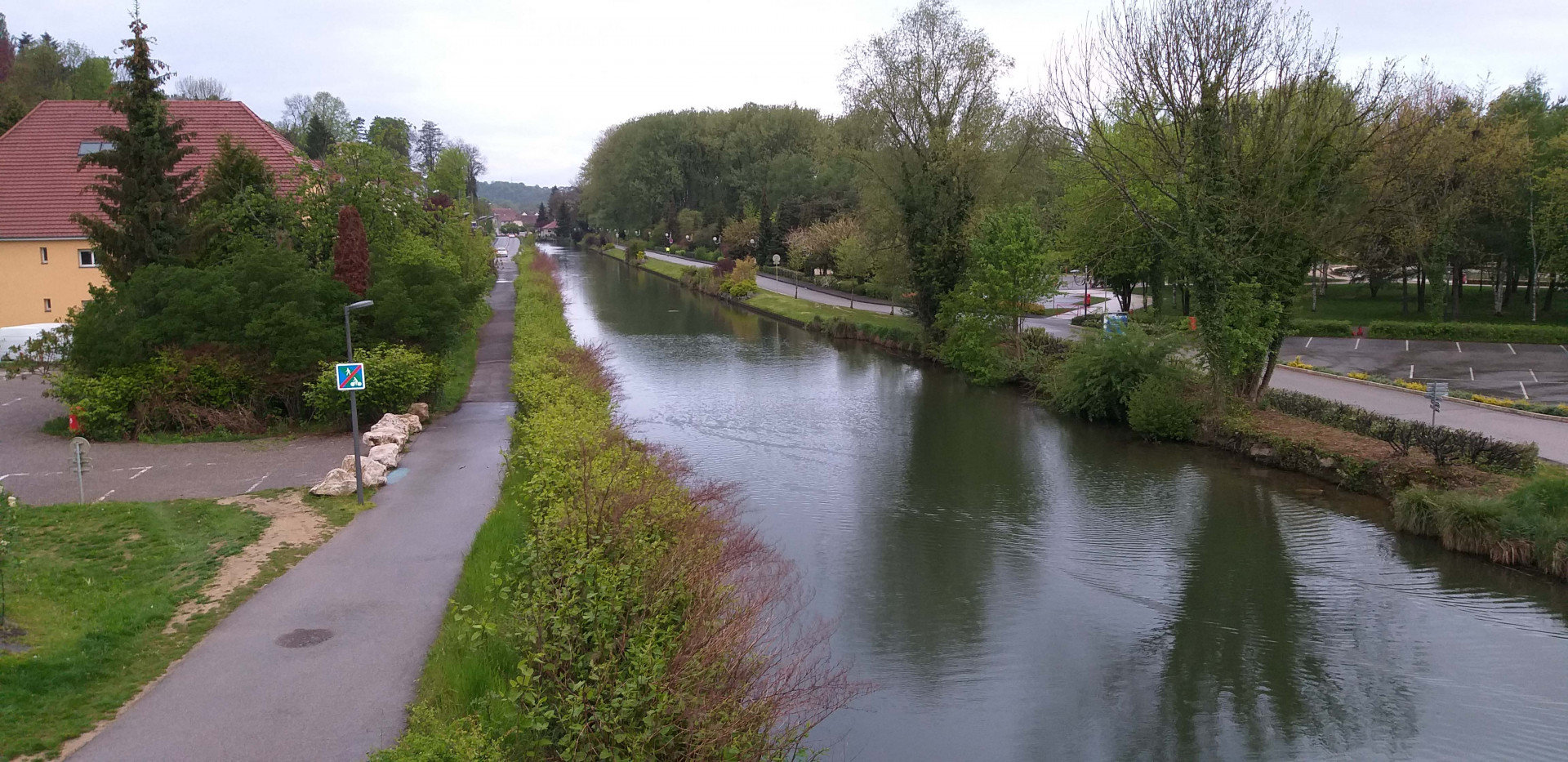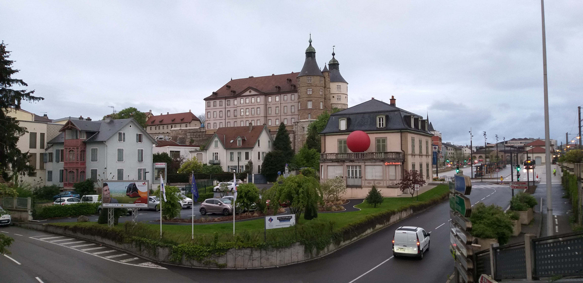 Монбельяр встретил пасмурной и дождливой погодой. Немного поплутав по развязке, выезжаем к нашему отелю. Заселившись и сверившись с картами, решаем до центра прогуляться пешком. Делаем небольшой крюк, сворачивая сразу не туда от отеля, пресловутая развязка, на которой петляли ранее на машине. Зато выходим на ухоженную пешеходную тропу, которая в итоге привела нас прямо в центр. Встречных людей не много, можно сказать совсем нет, по причине плохой погоды и позднего, для среднего европейца времени суток. Со всеми дневными переездами, вышли из отеля на прогулку около восьми вечера. Пока добирались до центра опустились сумерки и дождь припустил сильнее. Решаем вернуться в отель, ноги размяли и хватит.