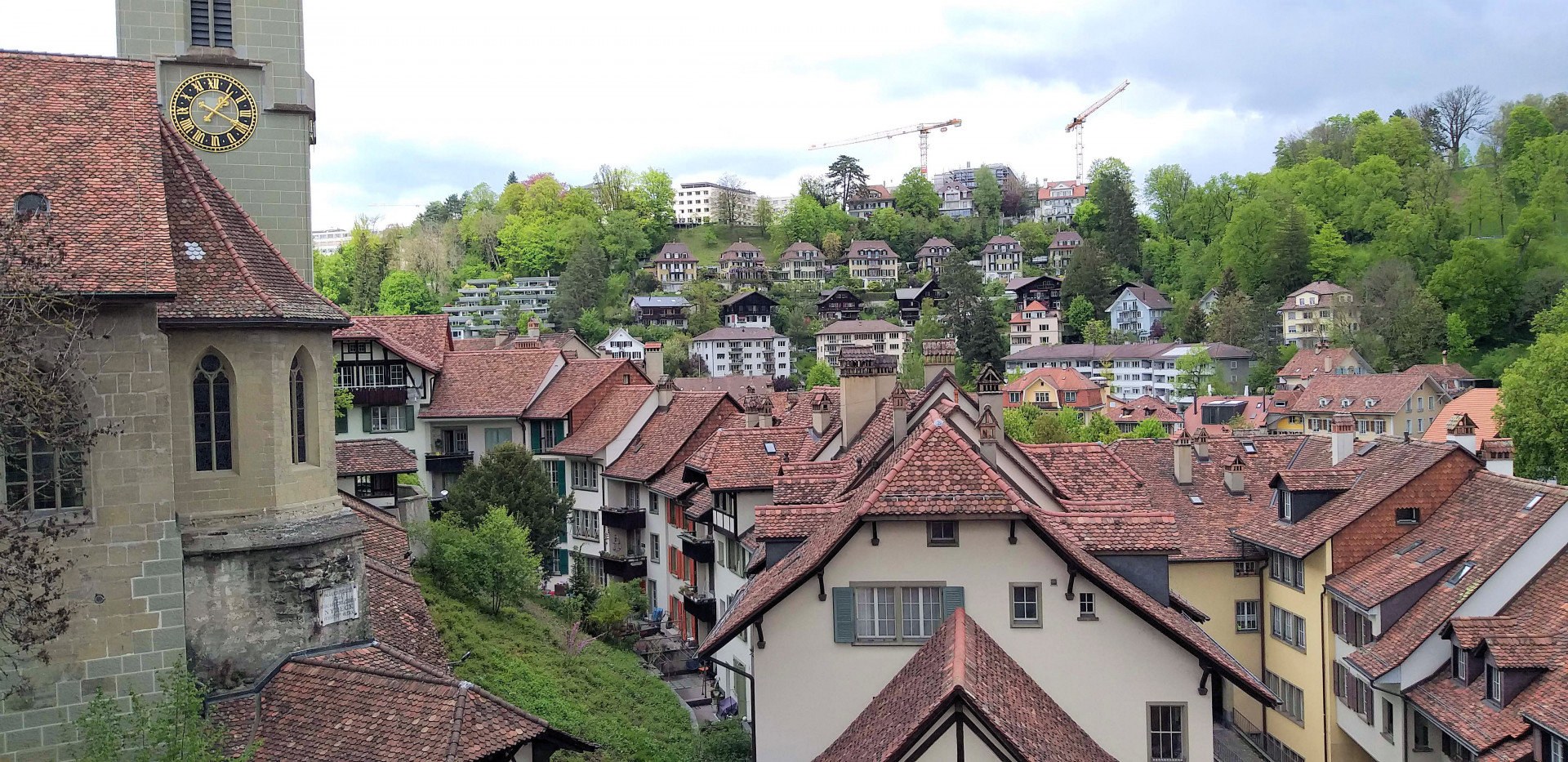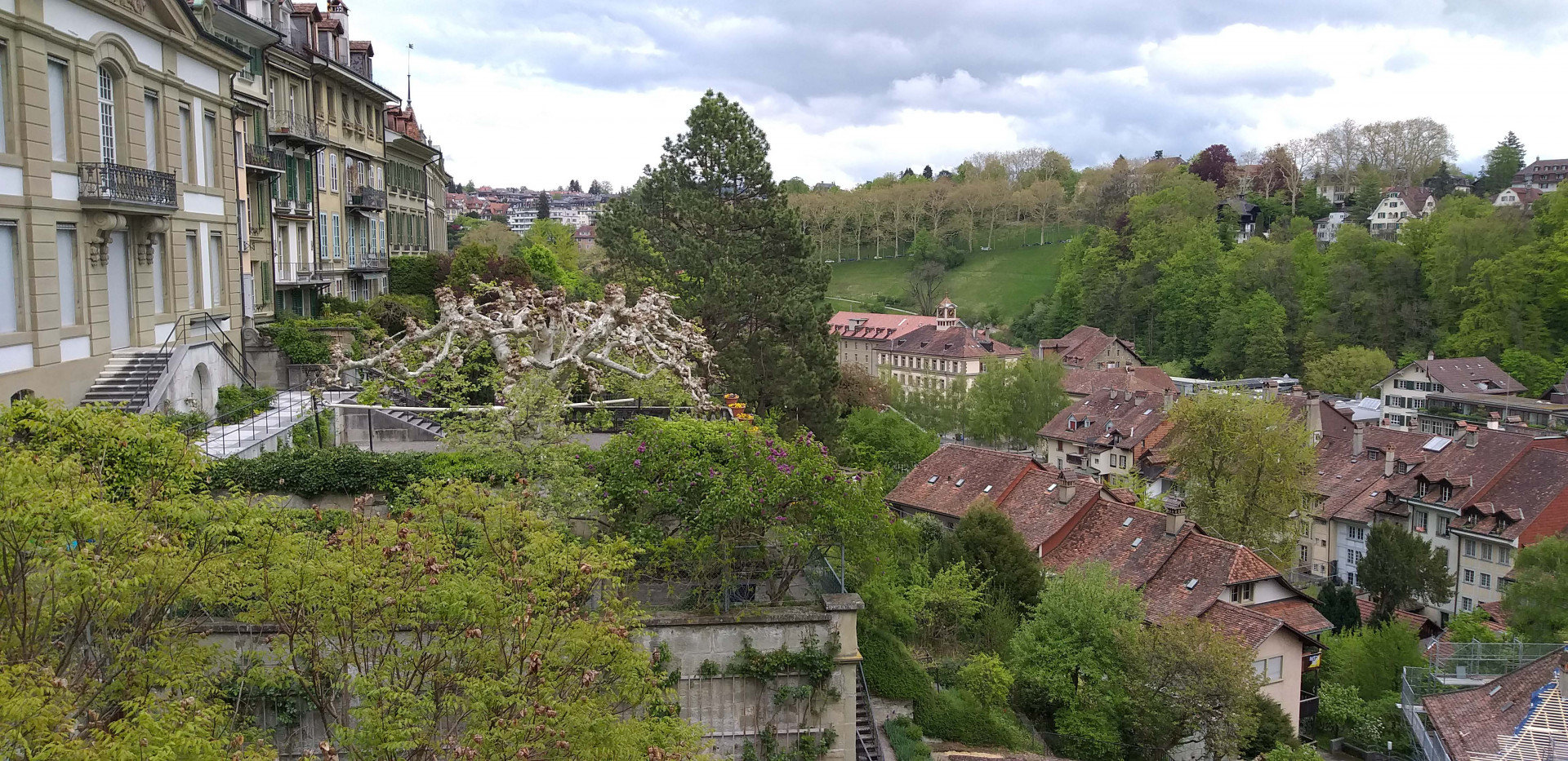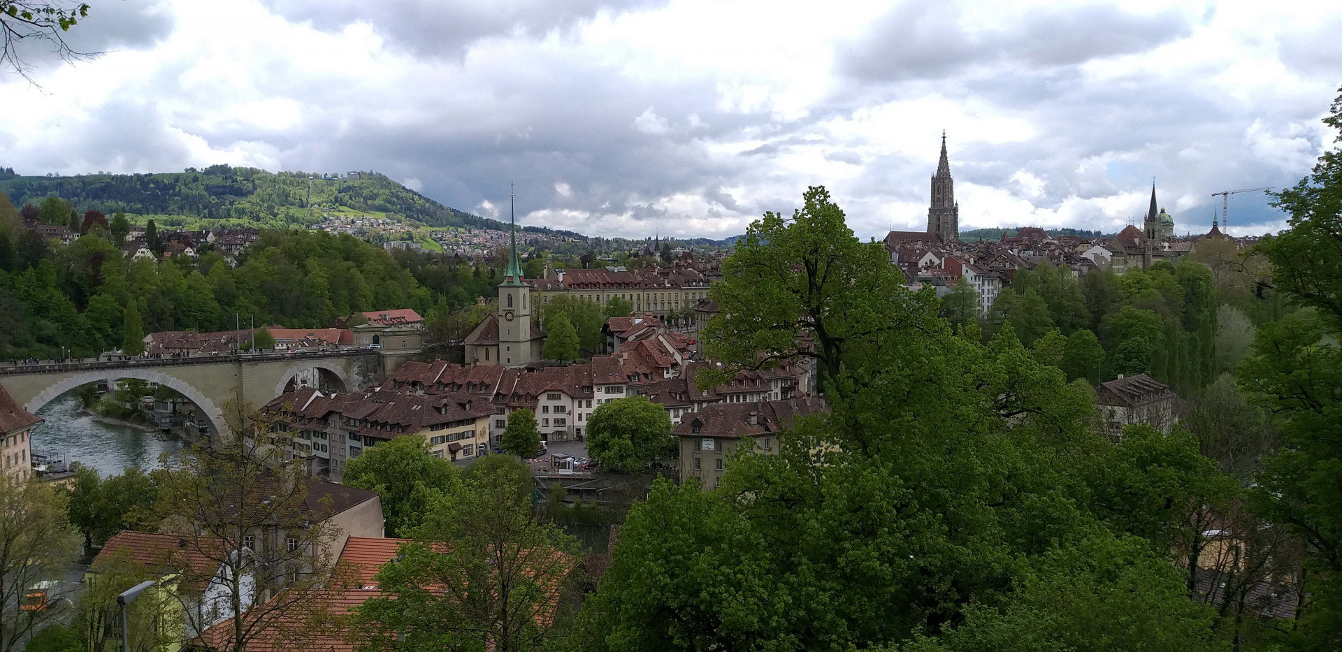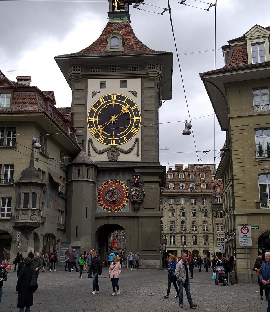 Въезжаем в Берн. С подъема на холм по улице Aargauerstalden открывается отличный вид на город. Паркуемся у обочины и делаем несколько снимков. Решаем спуститься вниз и в итоге находим замечательное место для стоянки возле моста Нюдеггбрюке. Поднимаемся вверх по улице Герехтигкайтсгассе (Gerechtigkeitsgasse). Доходим до Часовой башни (Zytglogge). Огибаем башню слева и по Мюнстергассе (Munstergasse) спускаемся до Бернского собора (Berner Münster). Заходим в парк позади церкви (Munsterplattform), который с основания использовался как кладбище. В дальнем углу парка обнаруживаем странное сооружение, лифт (Aufzug Matte-Plattform), на котором, за символическую плату, мы спускаемся к реке Аре.