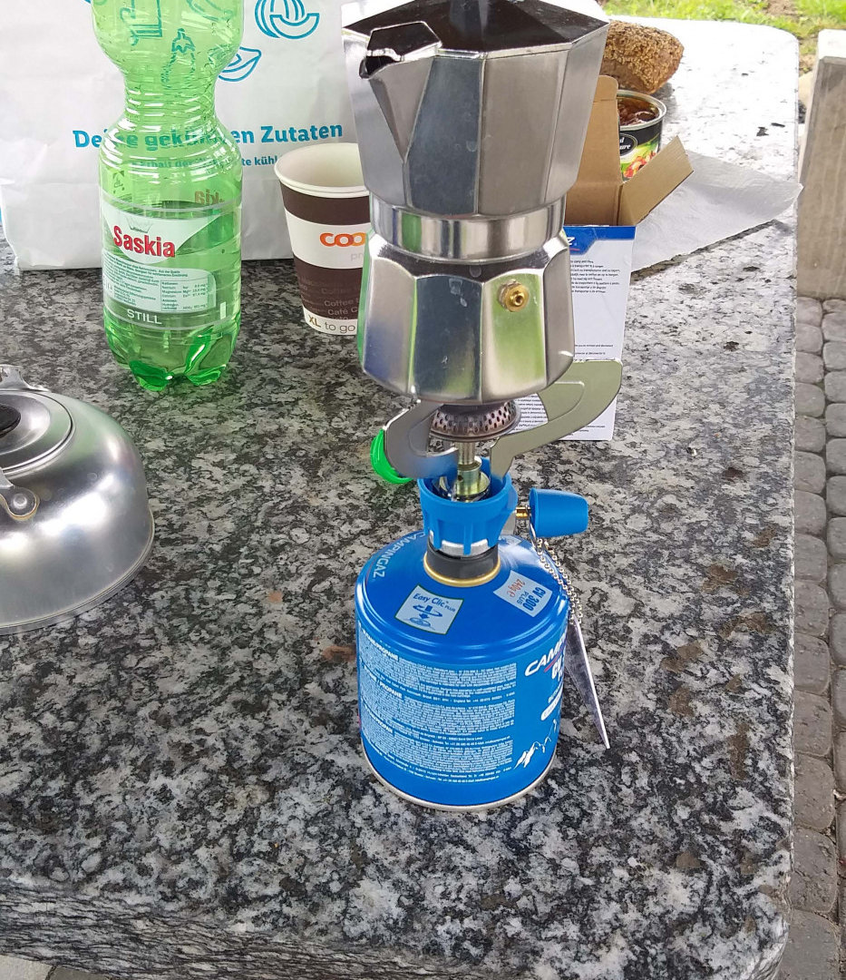Удалось купить картриджи для газовых горелок в Декатлоне в пригороде Берна. На ближайшей парковке опробуем их, кипятим воду для термоса с собой в машину и кофе в кофеварке. В последствии на каждой технической остановке так и будем делать.