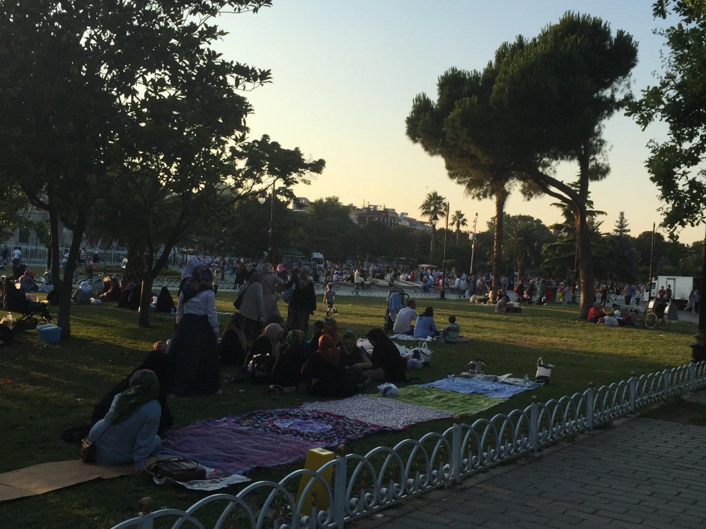 Смотреть меньше, конечно не стали. Но лучше все же одеваться более закрыто. Нет, вас не освистают и не побьют камнями. Но зачем? В период Рамадана для туриста по большому счету ничего не меняется. Хотя да, людей в центре сильно больше. И эти люди они одеты в черное с головы до ног и не едят весь световой день. Не едят в течении светового дня, но на закате устраивают на газонах что то типа нашего Новогоднего застолья.
