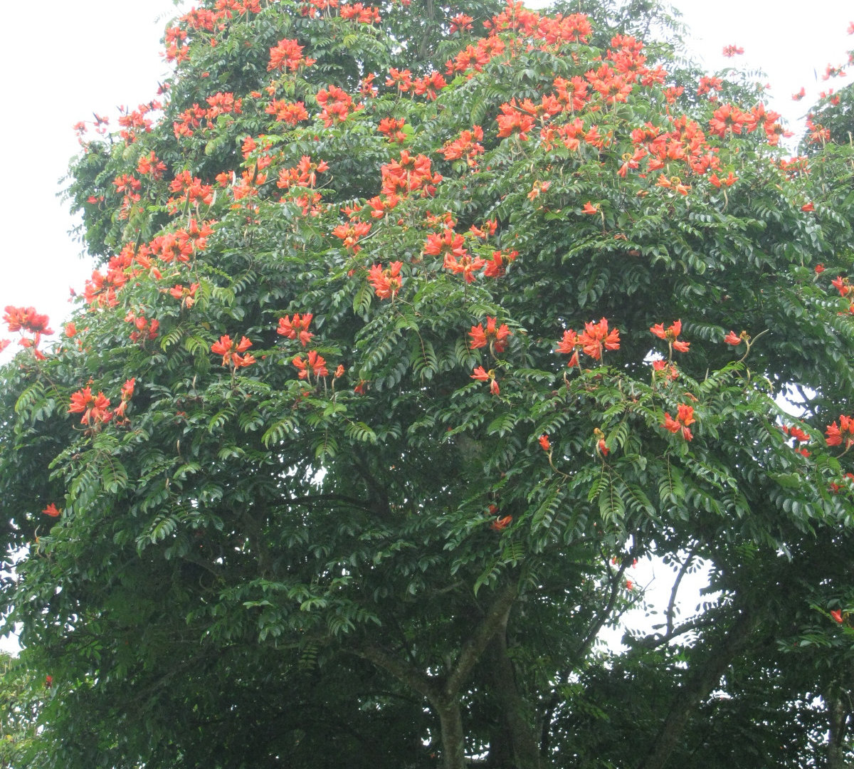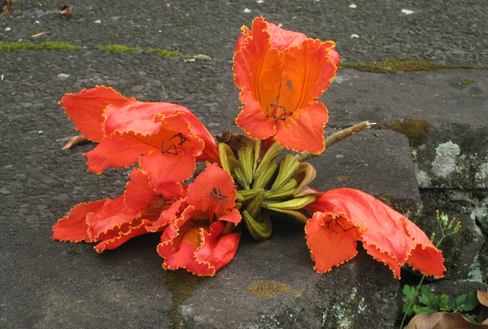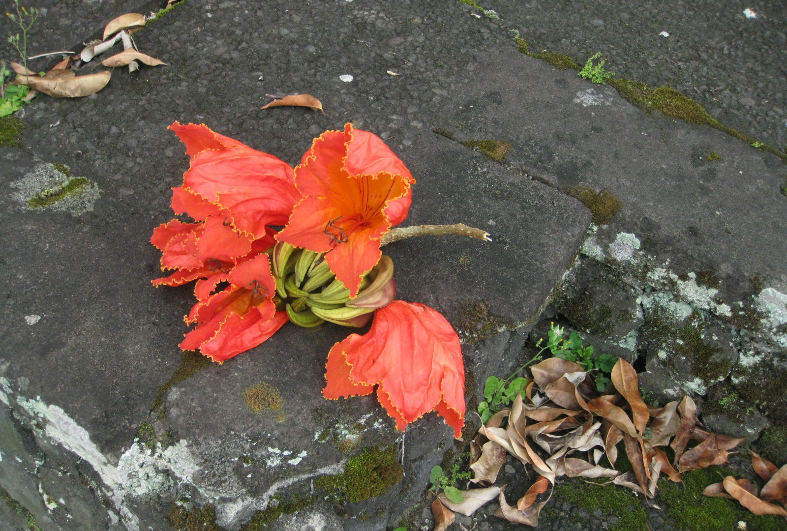 Вокруг росли удивительные деревья с огромными красными цветами. Я такие уже видела раньше. Цветы растут высоко, когда они отцветают, то падают вниз, распадаясь на лепестки. Каждый лепесток размером с мужскую ладонь. Я никогда не видела целые цветы вблизи, а фотоаппарат мой не мог сильно приблизить их для меня.