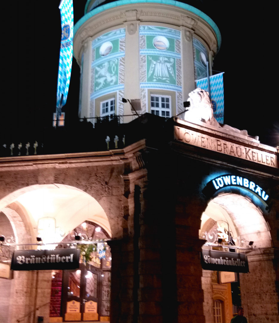 Вечером решаем посетить Lowenbraukeller Munchen, один из самых больших и известных пивных залов Мюнхена, построенный пивоварней Lowenbrau. Расположен на Штигльмайерплац (Stiglmaierplatz) на углу Нимфенбургер (Nymphenburger) и Дахауэрштрассе (Dachauer Strase). Здание пивной строилось в 1882—1883 годах и было открыто 14 июня 1883 года. Самый известный Мюнхенский ресторан Хофбройхаус (Hofbrauhaus, «Придворная пивоварня») с пивным садом, расположенный в Мюнхене на площади Плацль (Platzl), недалеко от центральной площади города Мариенплац мы посещали в прошлый наш приезд, и он не так интересен.