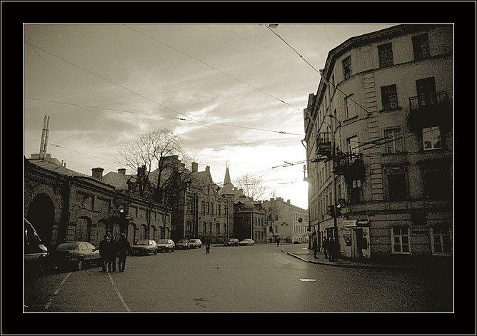 Театральное училище, студенты...Гуляем по городу, забредаем в какой-то огромный двор — поле с дорожками, спортивной площадкой, а со всех сторон — дома, заборы и решетки. Ищем выход. Попутно беседуем о разнице между Питером иМосквой.