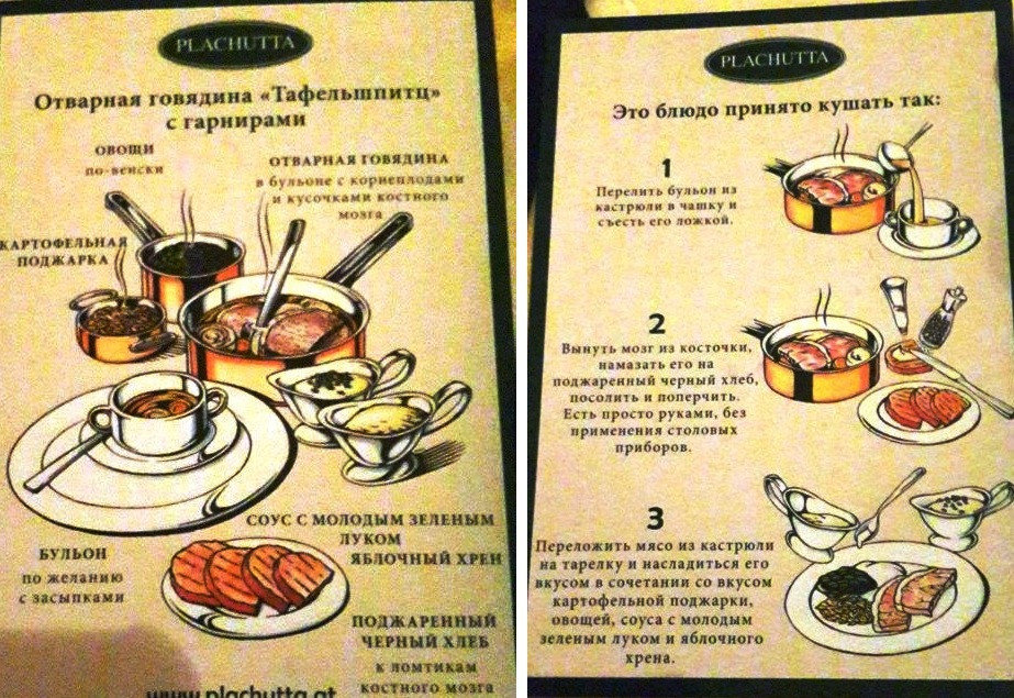Самое сложное для меня в Вене было то, что нас постоянно кормили. Разным, вкусным, интересным. Например, были в Плачутте. Коронное блюдо в этом ресторане – известный Тафельшпиц. Это отварная говядина на мозговой косточке в бульоне c овощами. Главная фишка тут – подача. Подают ее в специальных кастрюлях прямо на стол. Рядом в таких же невообразимо больших бадьях, которые они считают соусниками, ставят яблочный хрен и белый соус с зеленым луком. А еще кастрюльки с жареной картошкой, жареными хлебцами с чесноком и тушеные овощи. Чтобы мы не запутались, в каком порядке это все есть, каждому гостю полагается милая инструкция в картинках. Нас ждали – наша инструкция была на русском языке.