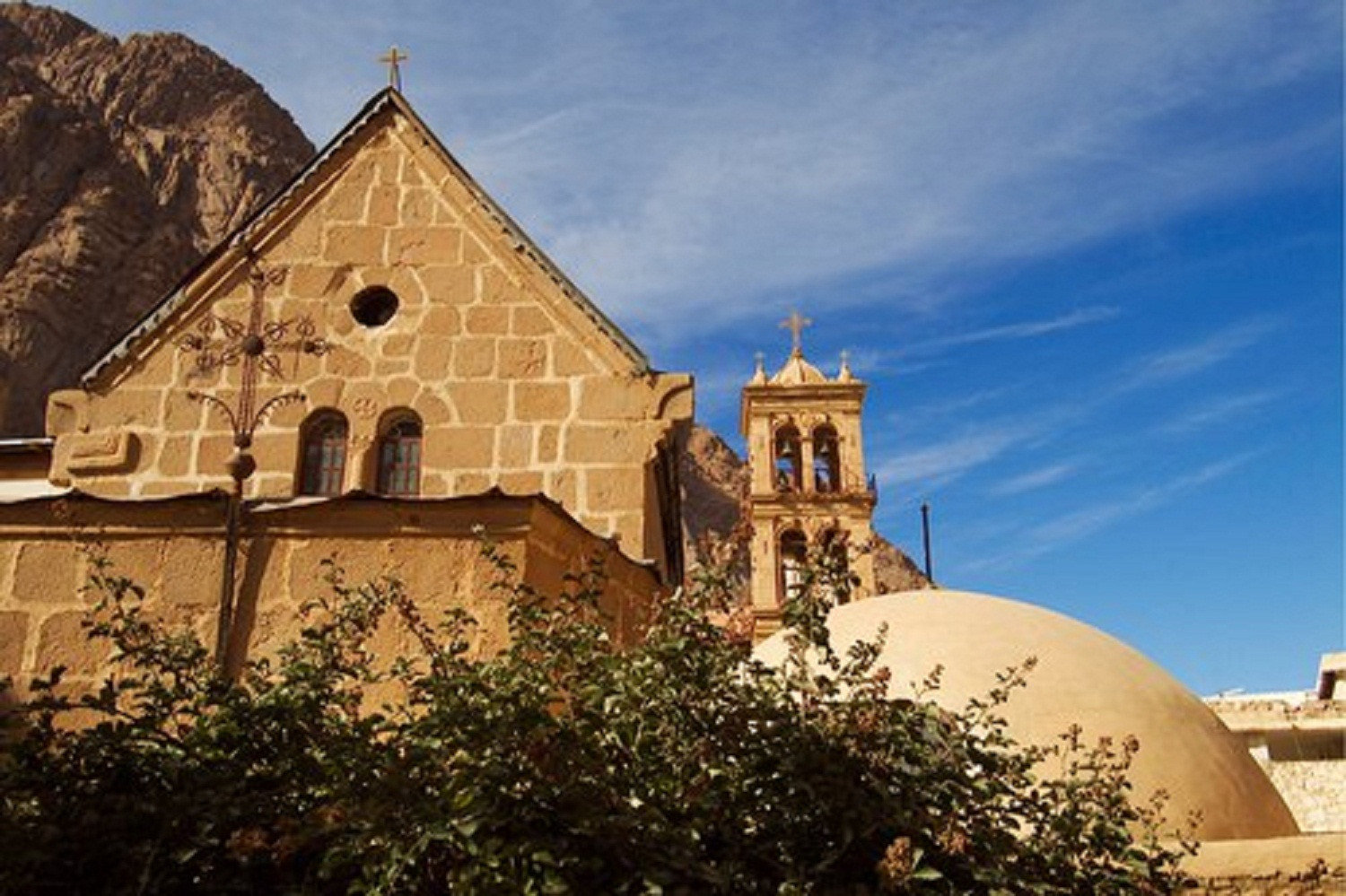 Издавна на этом месте, у Неопалимой Купины стали селиться по горам отшельники и подвижники. В период правления императора Константина, около 329 года, монахи Синая обратились к его матери святой Елене с просьбой о постройке возле Неопалимой купины маленькой церкви, посвящённой Богоматери, а также башни для убежища монахов на случай набегов кочевников. Прошение монахов было удовлетворено, ипостроена Церковка и жилища. И уже в VI веке, когда император Юстиниан I приказал построить мощные крепостные стены, окружившие предшествующие постройки святой Елены, и церковь, сохранившуюся до настоящего времени, а также направил на Синай солдат для защиты монахов, тогда и получилась такая укрепленная крепость, куда чужому трудно было проникнуть. Набеги кочевников и разбойников были не редкостью, а реальностью тех времен, к сожалению. А Куст продолжал расти уже внутри монастыря. Он находится позади главного храма Преображения, огражден каменной стеной, с которой свешиваются его длинные колючие ветви.