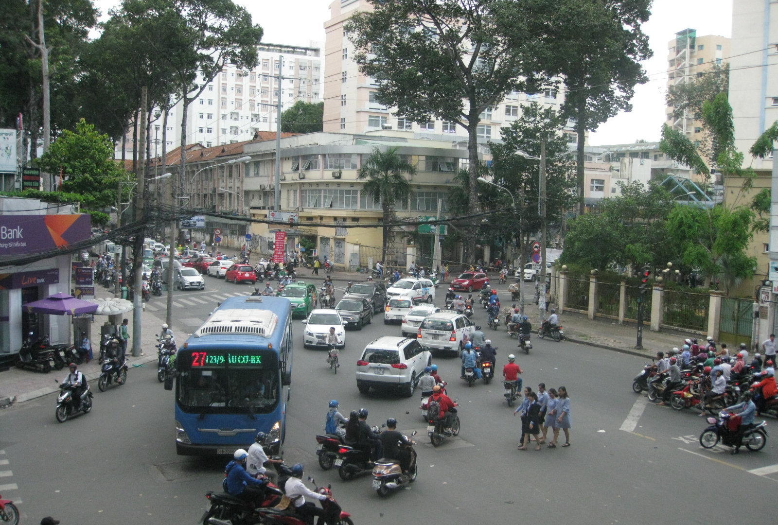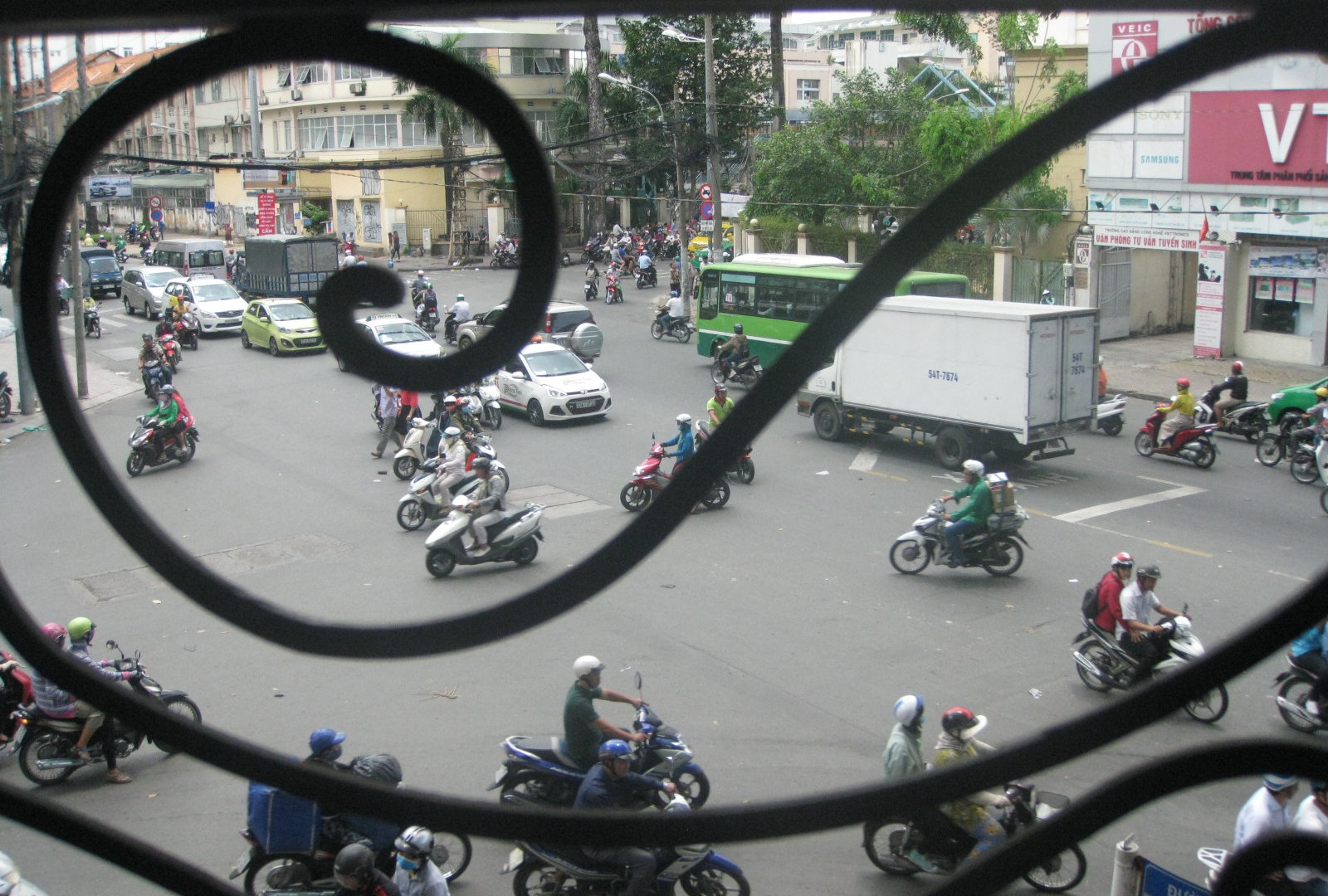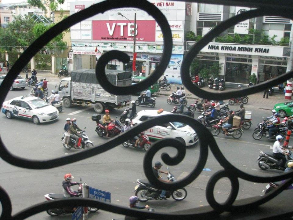 Так что сначала я нашла пиццерию, а позже- французское кафе. Там я сидела на открытой террасе второго этажа и разглядывала перекрёсток с безумным сайгонским движением.