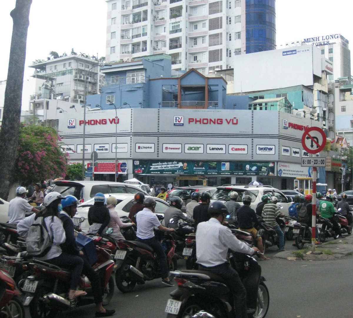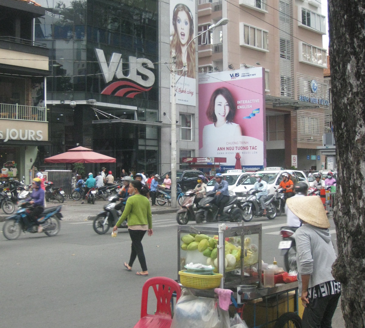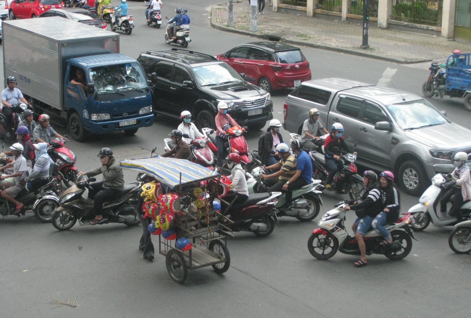 Так что сначала я нашла пиццерию, а позже- французское кафе. Там я сидела на открытой террасе второго этажа и разглядывала перекрёсток с безумным сайгонским движением.