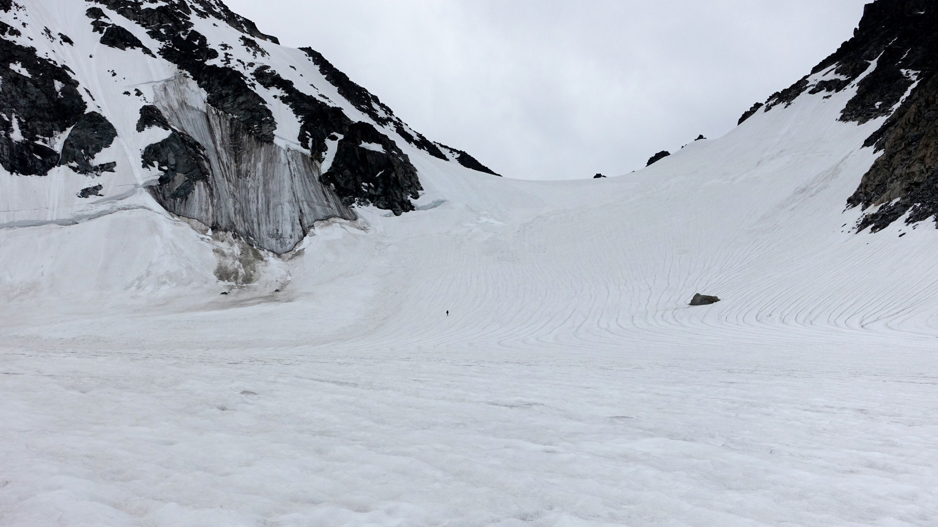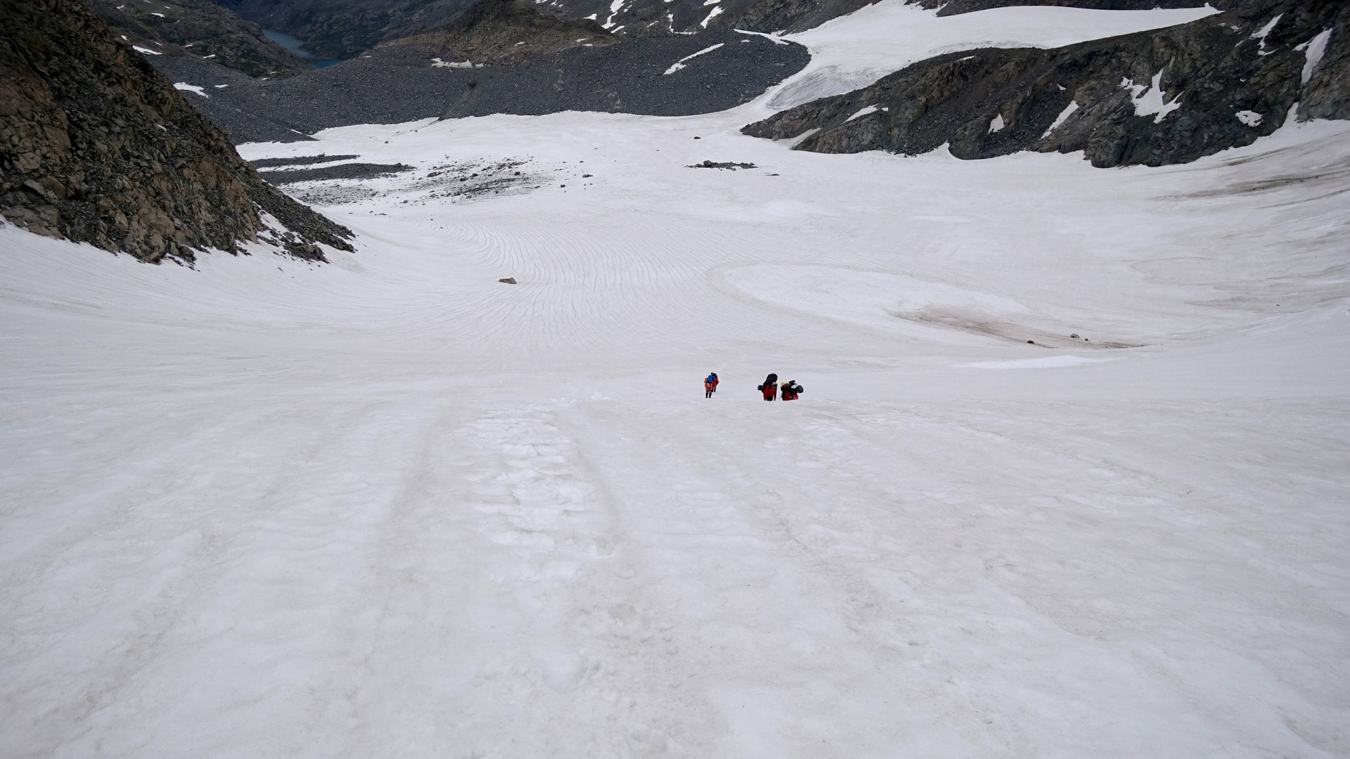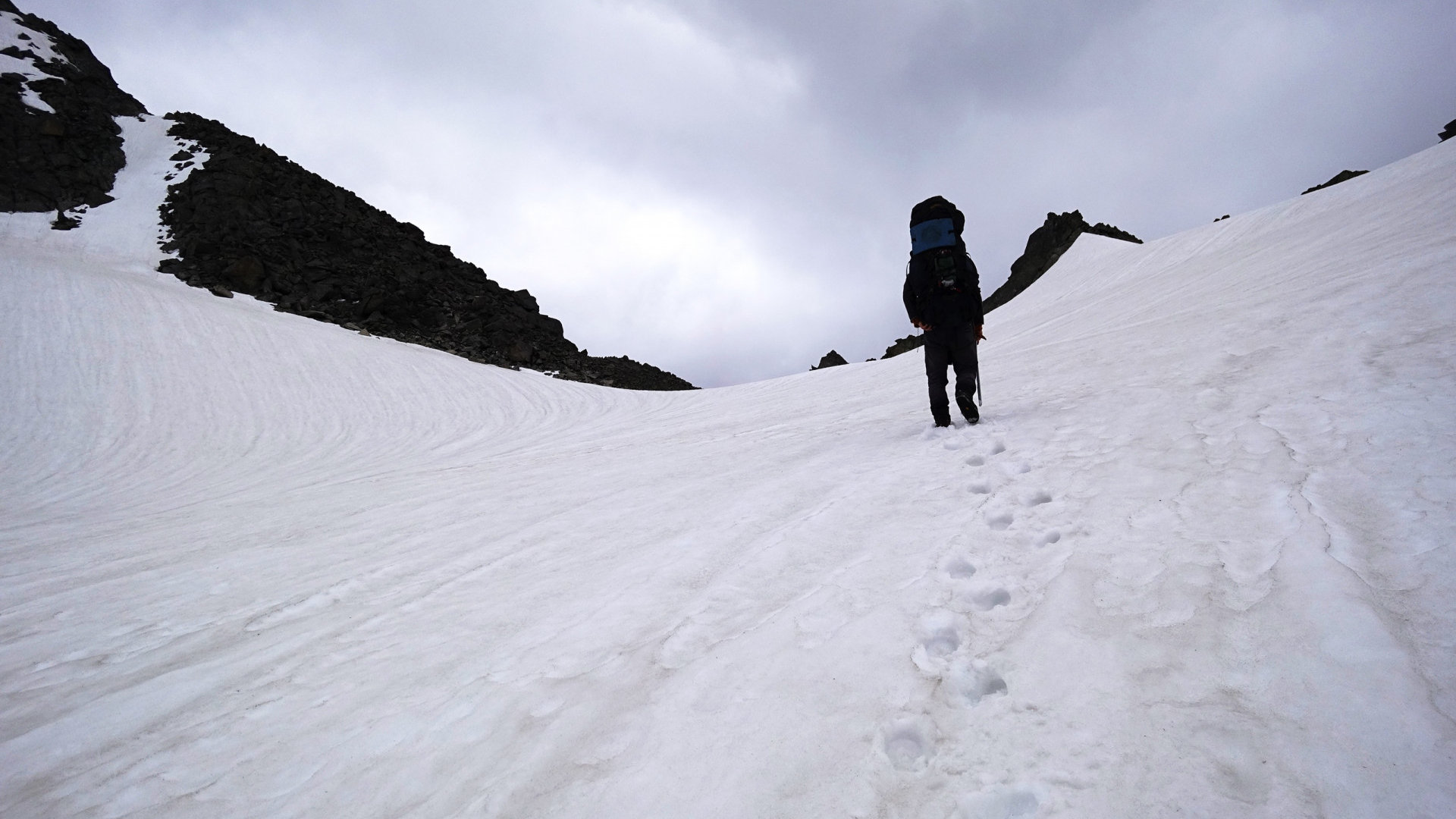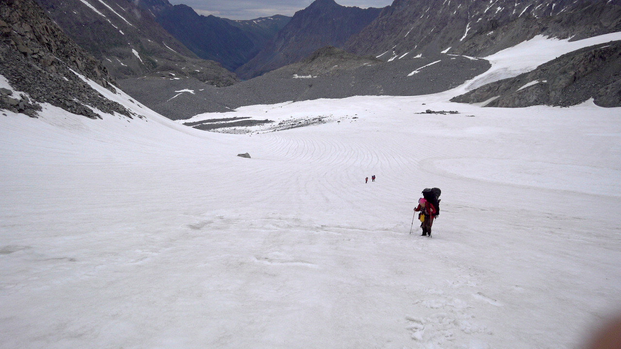 Подошли к леднику. Пока поднимались по уклону — снега было мало, но как только вышли на плоскую часть буквально утонули в снегу. Один шаг — и ты по пояс в снегу. Выбираешься секунд тридцать, делаешь еще шаг и снова по пояс в снегу. Вместо пяти минут подхода к перевальному взлету, мы застряли надолго. Эдик сказал, что пора поворачивать обратно.