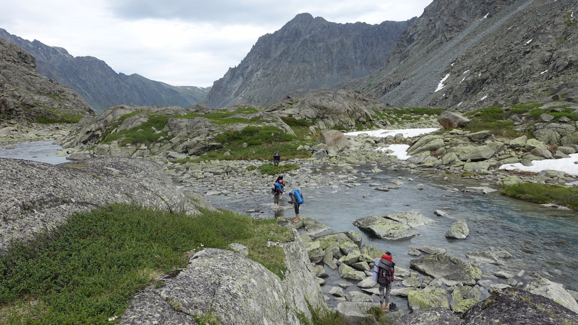 Нам еще предстоял непростой спуск. Сначала осторожно по осыпному склону ползем вниз, стараясь не спускать камни друг другу на головы. А потом начинается самое интересное — 2 километра маренного вала. Огромные булыганы выматывают. Постоянно ищешь более простой путь и не находишь. Ползешь с камня на камень. Все это еще и усугубил дождь. Но! Награда туристам за все пройденные испытания — отличное место стоянки в верховьях долины Абиак. Некий Стоунхендж с совершенно завораживающими окружающими пейзажами вокруг. Новички были большие молодцы, не смотря на трудности, шли дружно.