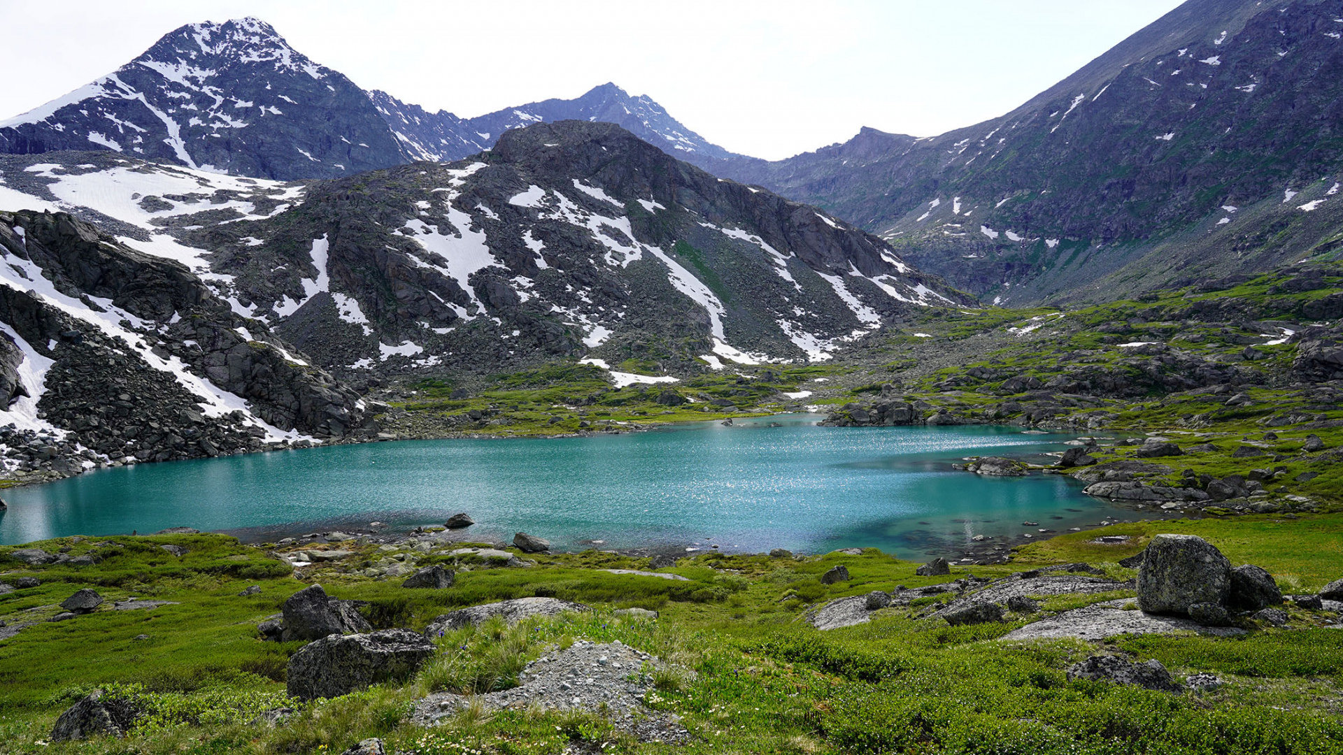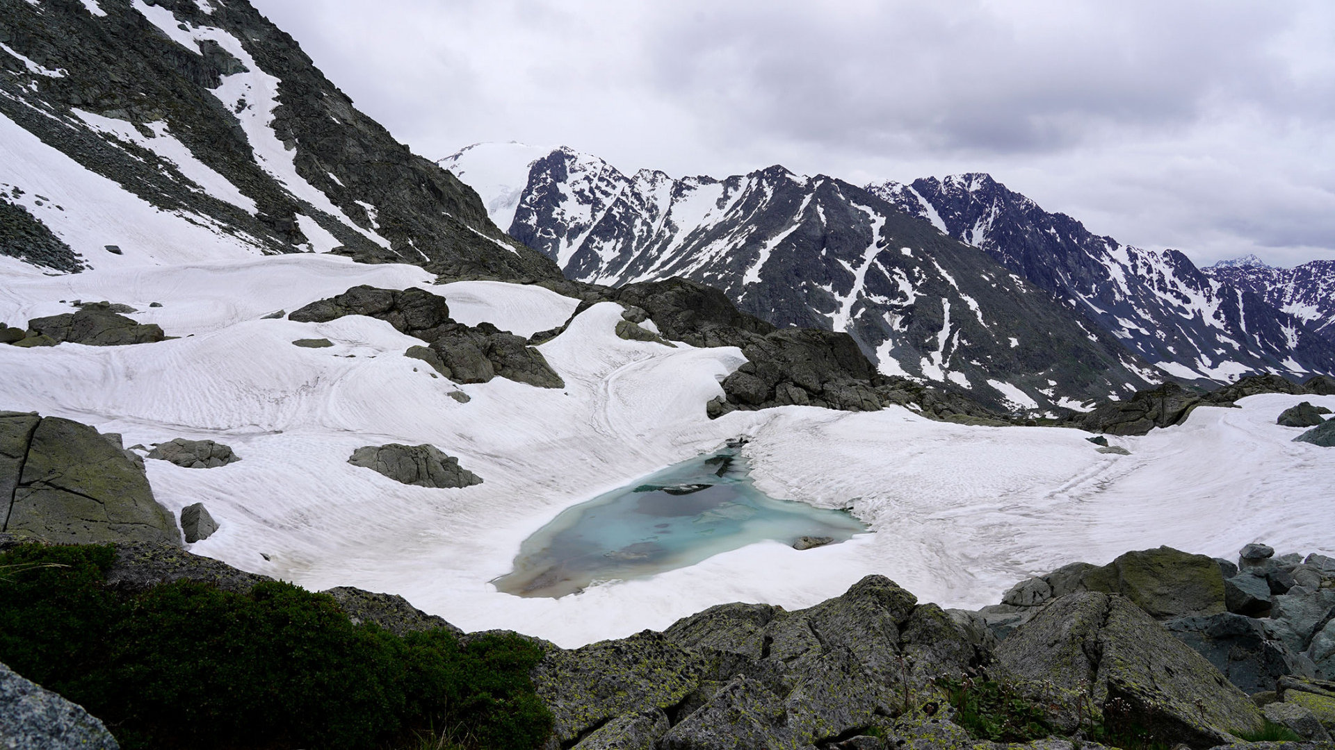 Подойдя под самый перевал, встали лагерем. Это был наш первый ледовый перевал на маршруте. Категория его 1Б — с одной стороны он снежно-ледовый с трещинами, с другой — осыпной. Зовут его Абиак Западный. У нас три человека в группе, для которых такой поход впервые, а перевал вызывает опасение. Но ведь у всех начинающих туристов когда-то бывают первые категорийные перевалы. Сходив в этот же день в небольшую симпатичную радиалку к перевалу Граненому, посмотрев на красивое горное озеро, мы мысленно готовились к завтрашнему штурму.