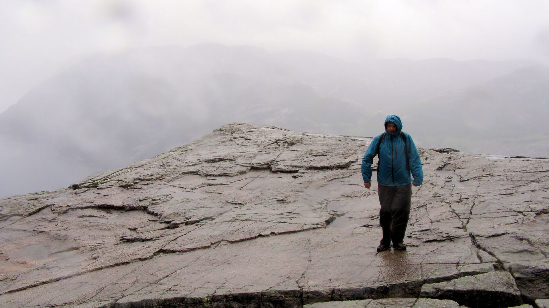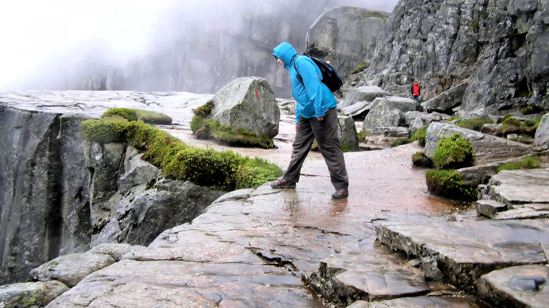 Выйдя на улицу, увидели у берега косуль. Вкусно позавтракав в ресторане при отеле, мы начали собираться к подъему на Preikestolen. Плакат предвещал 6-ти часовой путь туда и обратно. Начался дождь. Взяв дождевики, у меня был из дома, но можно приобрести в сувенирном магазине, с надписью Норвей, мы пошли к началу пути.