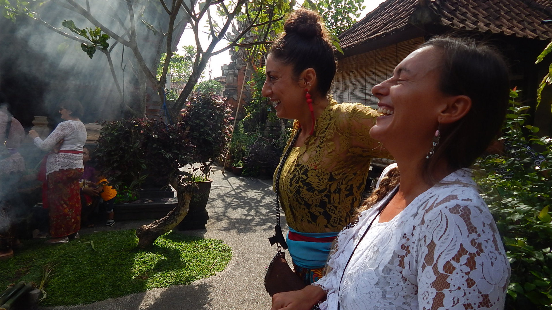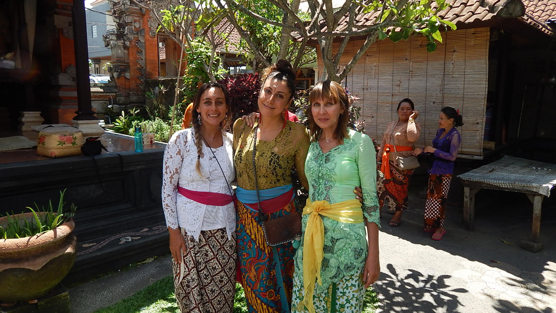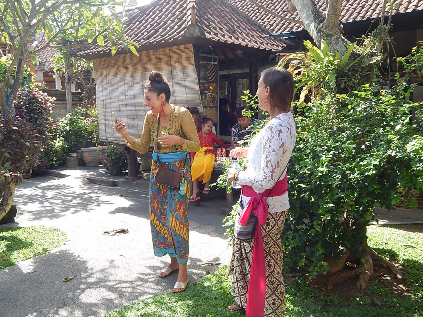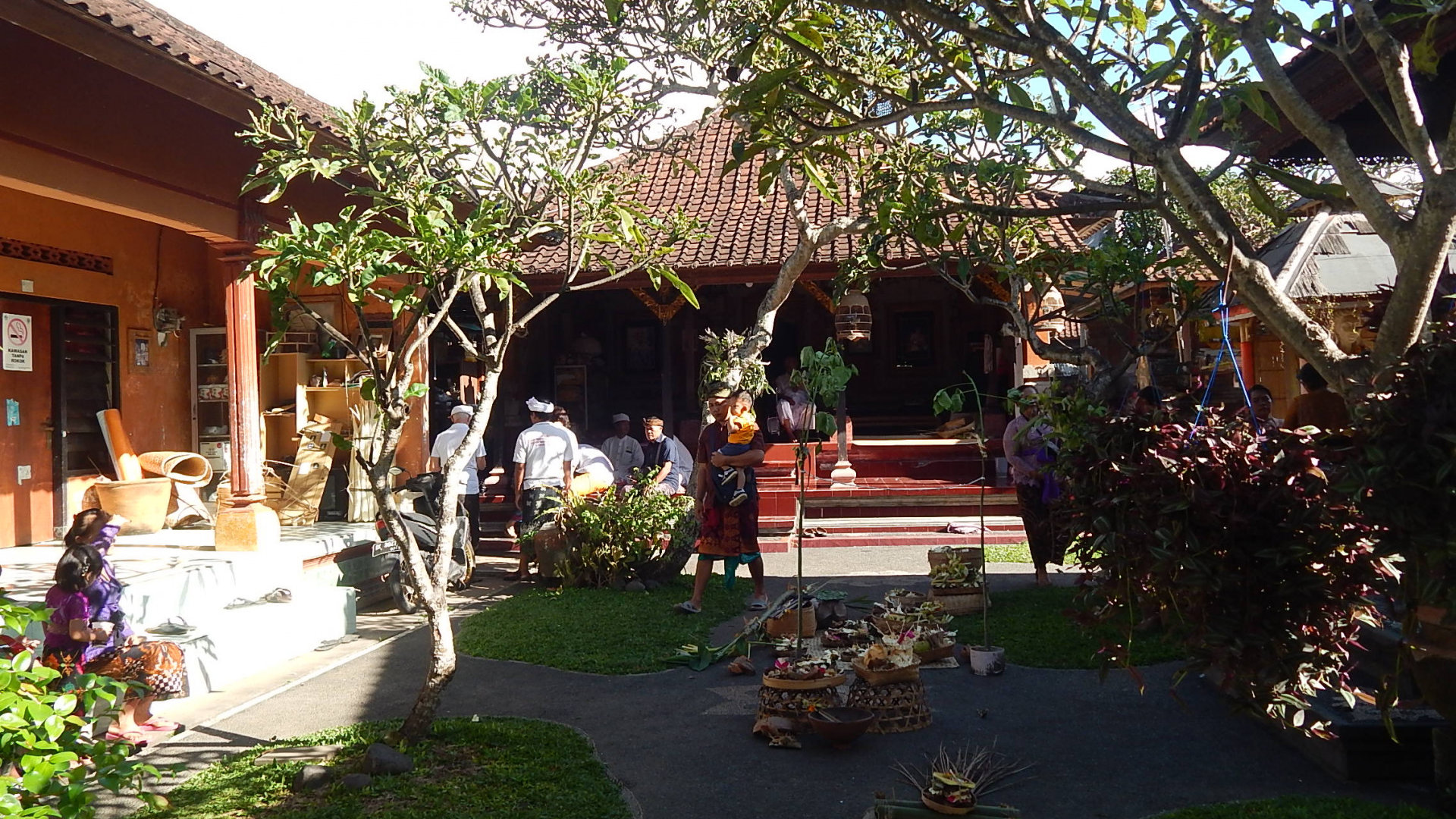 К восьми утра мы были готовы отправляться на церемонию. Она проходила не в нашем доме, а в специальном месте, предоставленным банджаром(общиной). Я забралась пассажиром на байк соседки. В узком саронге пришлось сесть боком и вцепиться в приделанную для этого железяку .