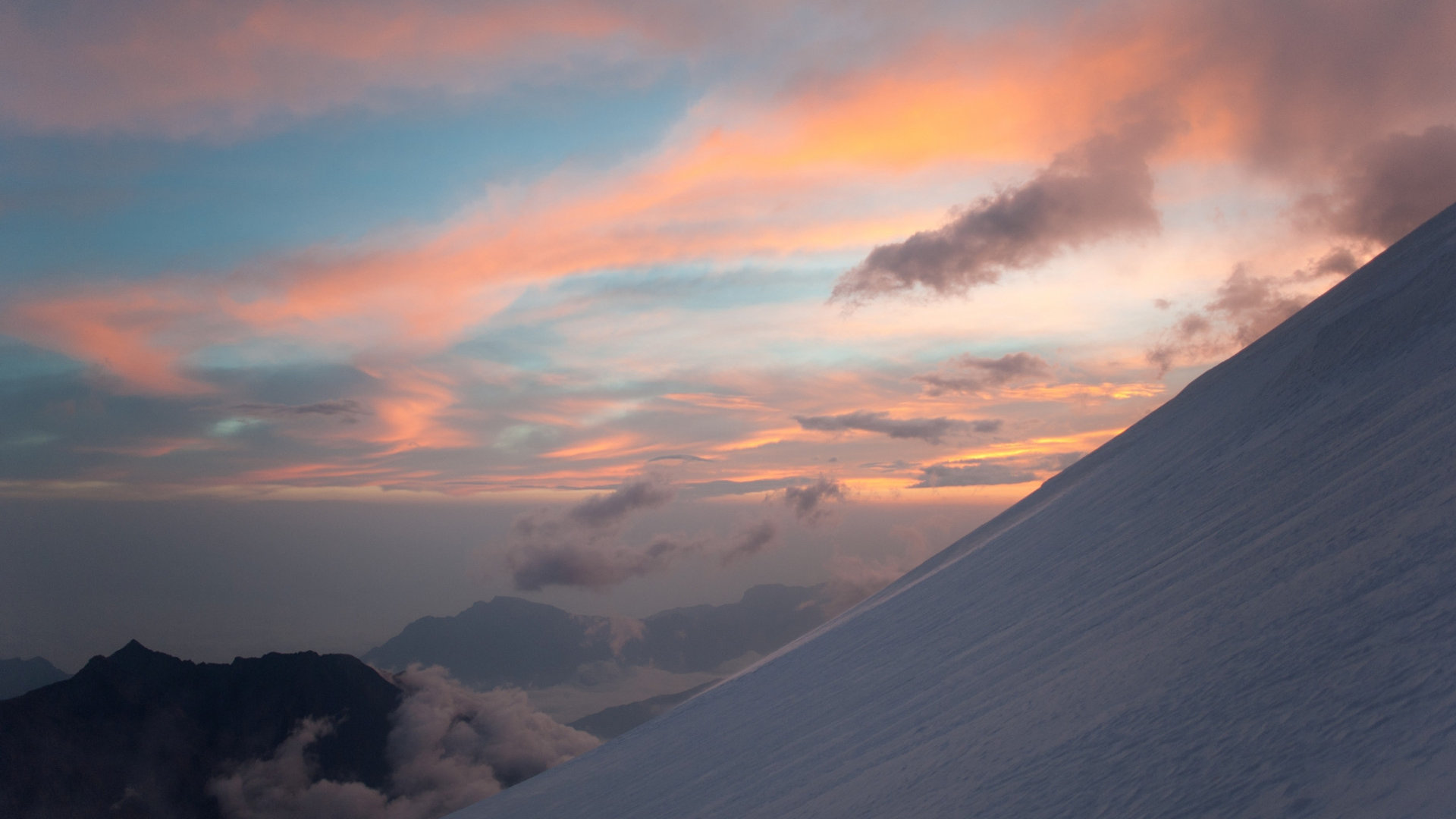 Сначала набор высоты очень плавный, идти легко, только под ноги надо смотреть и трещины перепрыгивать. Погода непонятная – то облака налетят, то так раздует, что все звезды видно. Так и шли, надеясь, что пронесет. На рассвете как раз на пару минут сдуло облака, и мы увидели это: