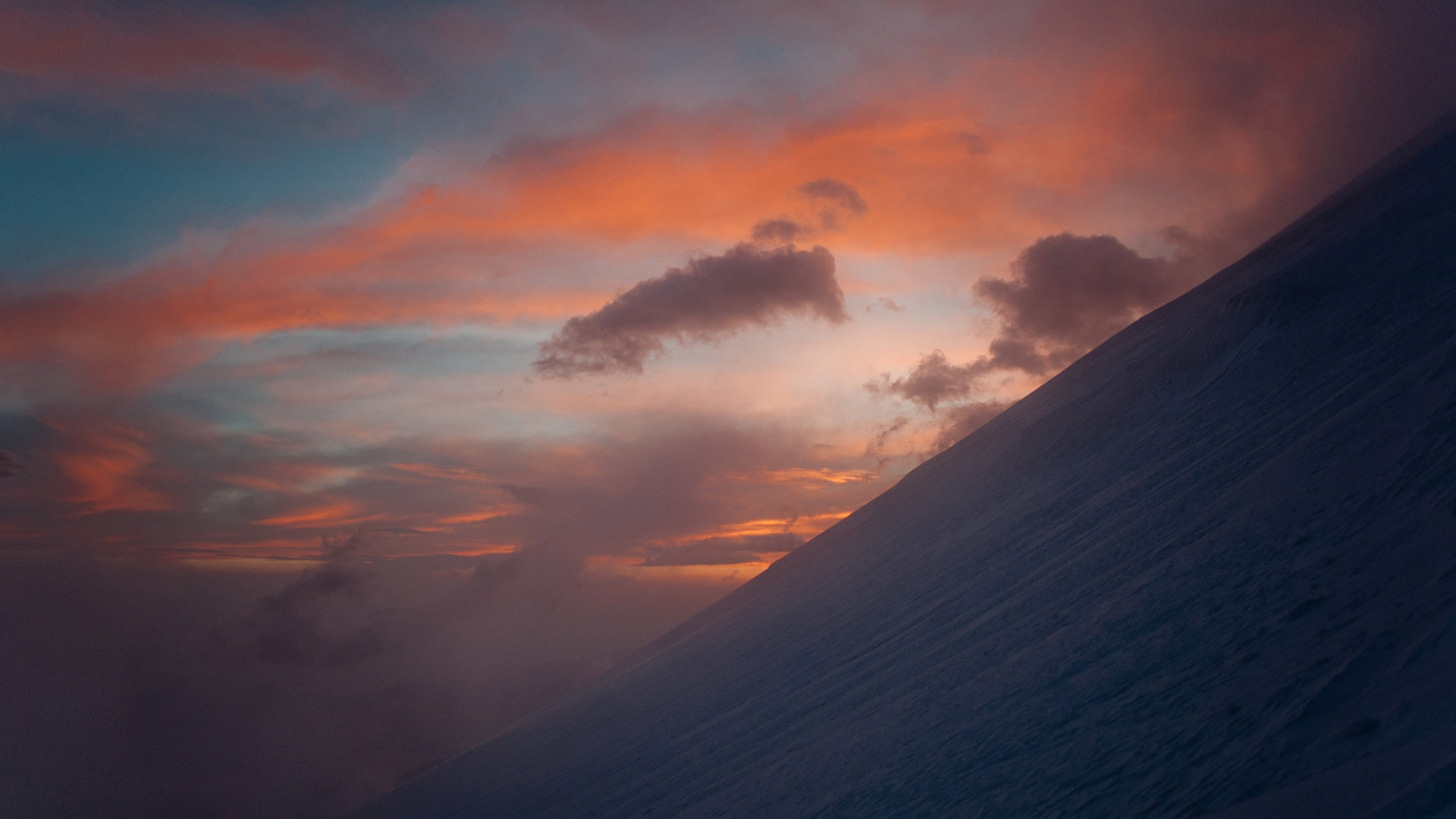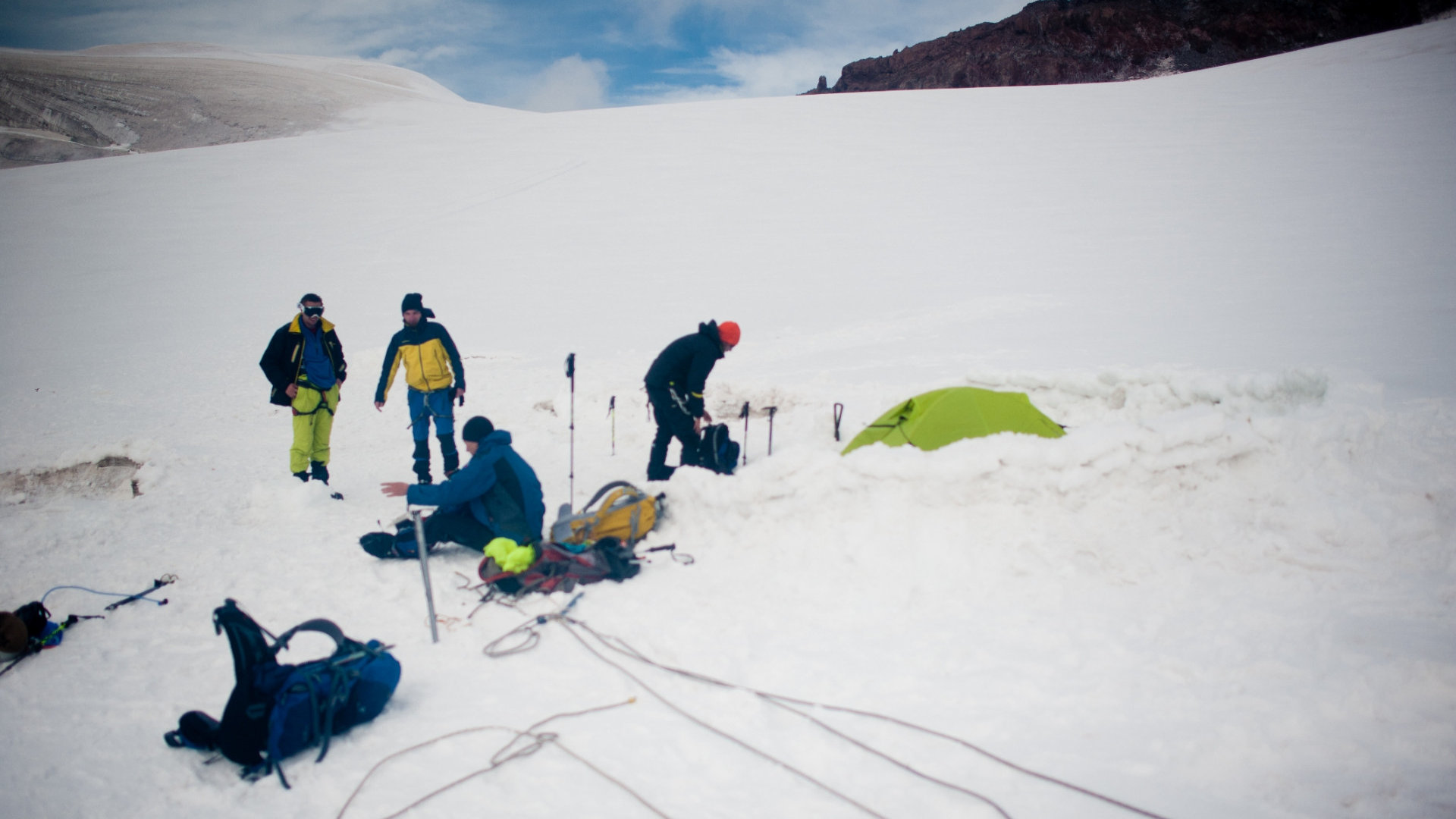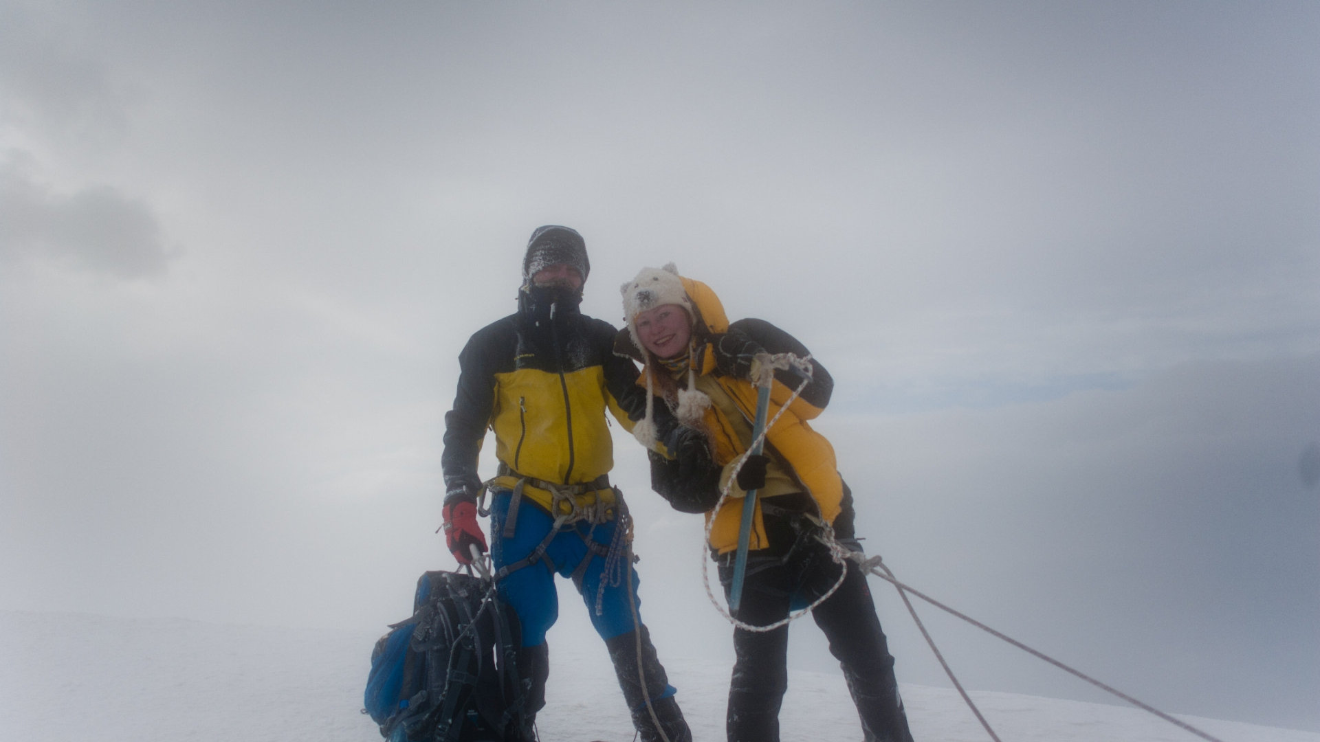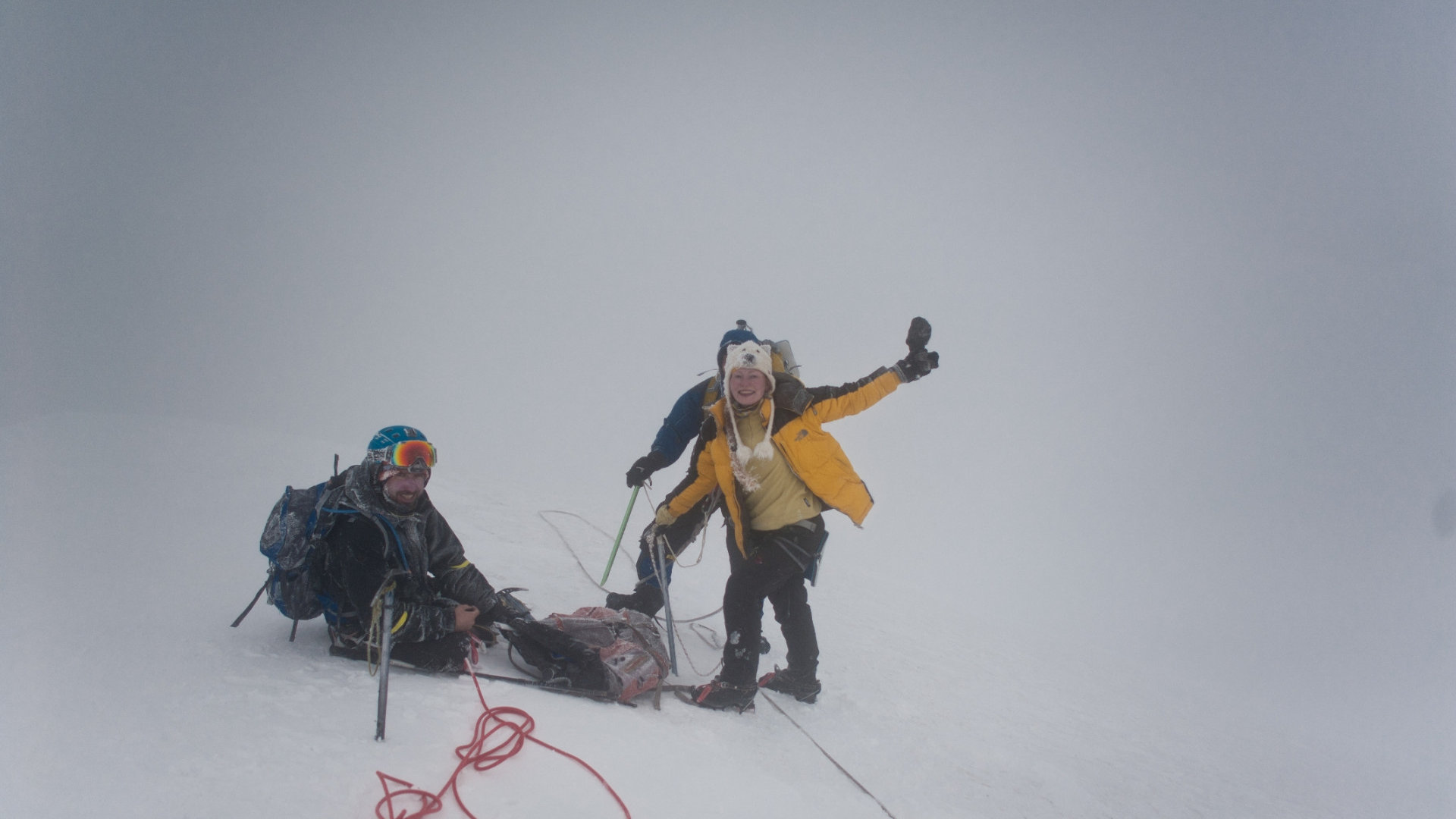 И как раз в это время погода начала портиться – ветер подул, ледяная крошка в лицо, пригибаешься так низко, как только можешь, чтобы не останавливаться и продолжать идти. В какой-то момент чуть назад не повернули, парни даже с GPS не могли понять, где мы, настолько ничего не было видно. На самом деле вверх толкала только одна мысль: «Я не хочу делать это снова», ведь если спуститься, то завтра нужно заново все это проходить.