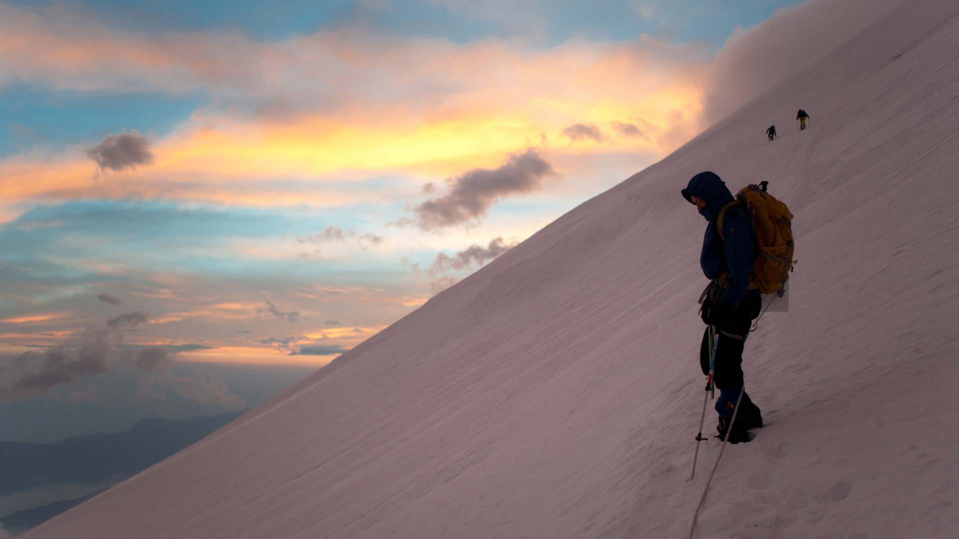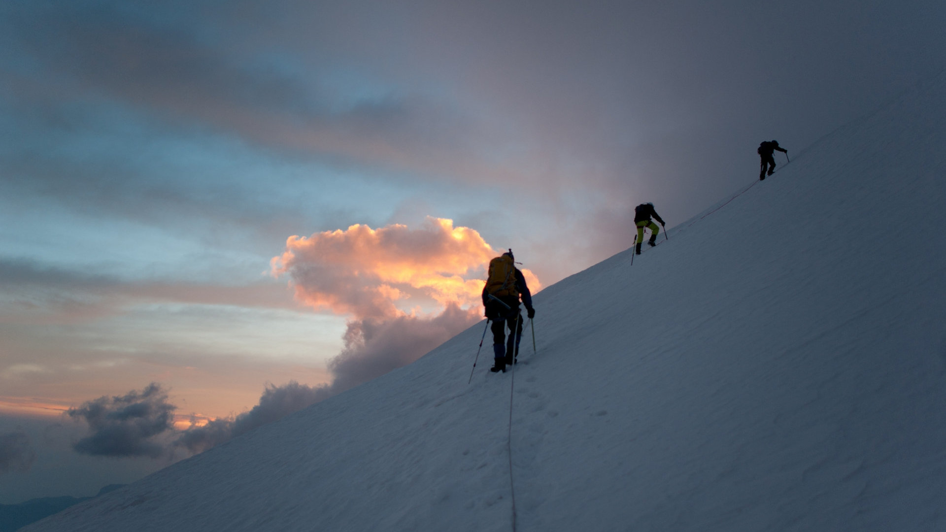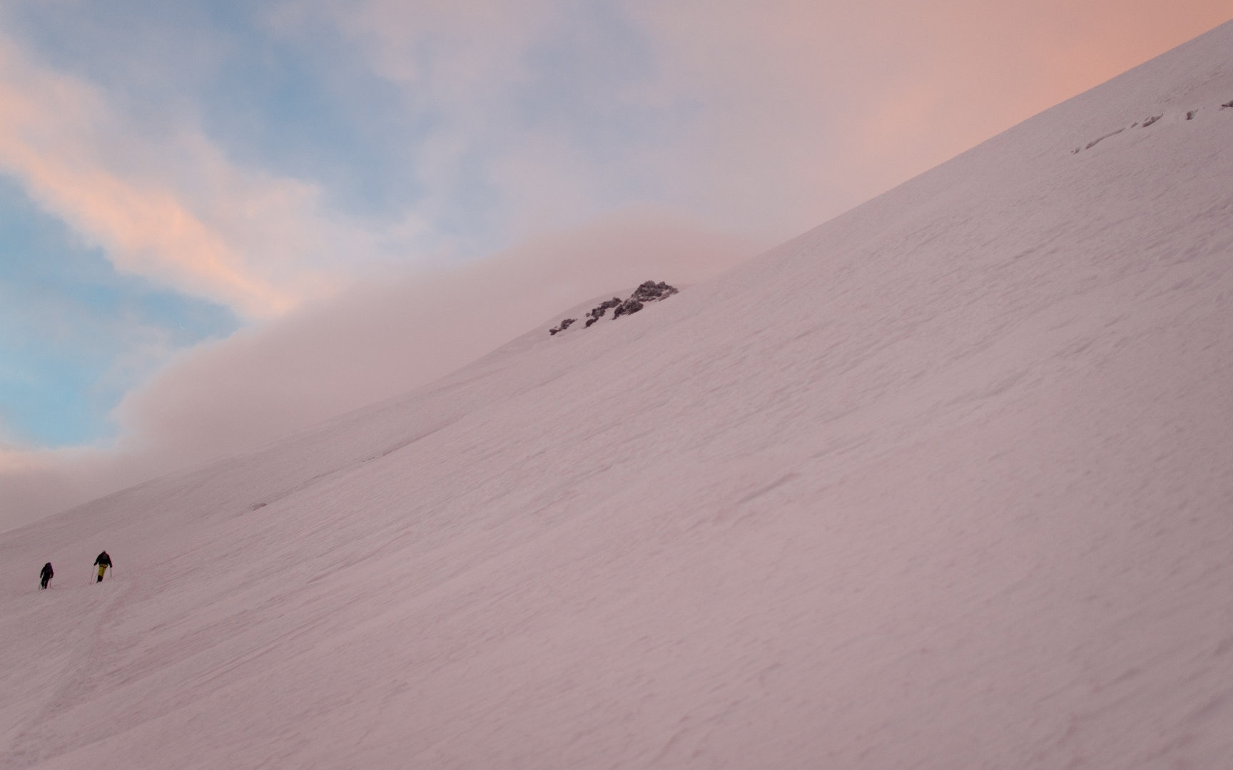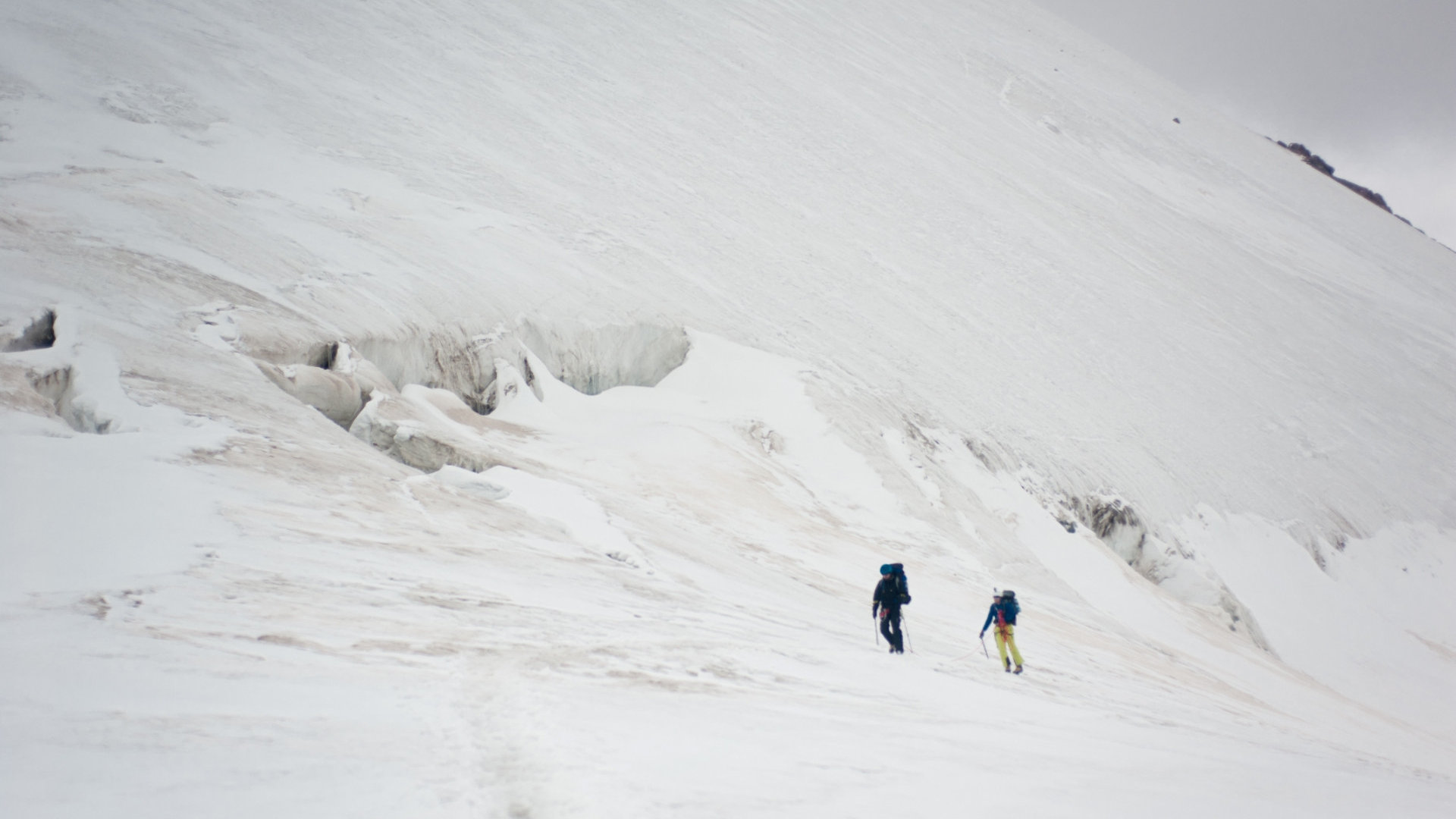 И как раз в это время погода начала портиться – ветер подул, ледяная крошка в лицо, пригибаешься так низко, как только можешь, чтобы не останавливаться и продолжать идти. В какой-то момент чуть назад не повернули, парни даже с GPS не могли понять, где мы, настолько ничего не было видно. На самом деле вверх толкала только одна мысль: «Я не хочу делать это снова», ведь если спуститься, то завтра нужно заново все это проходить.
