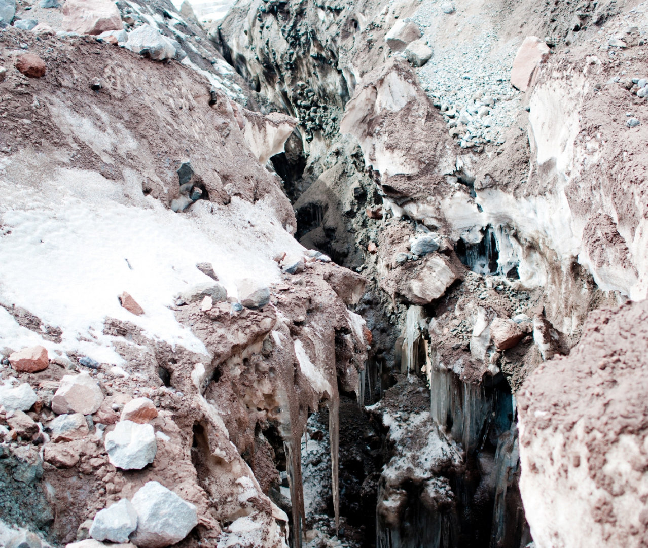Пока идешь, видишь много трещин, и тропинку потерять довольно легко. Направление-то в целом ясно, но все равно, даже при свете дня иногда приходилось высматривать указательные туры и отыскивать пропавшую тропинку.