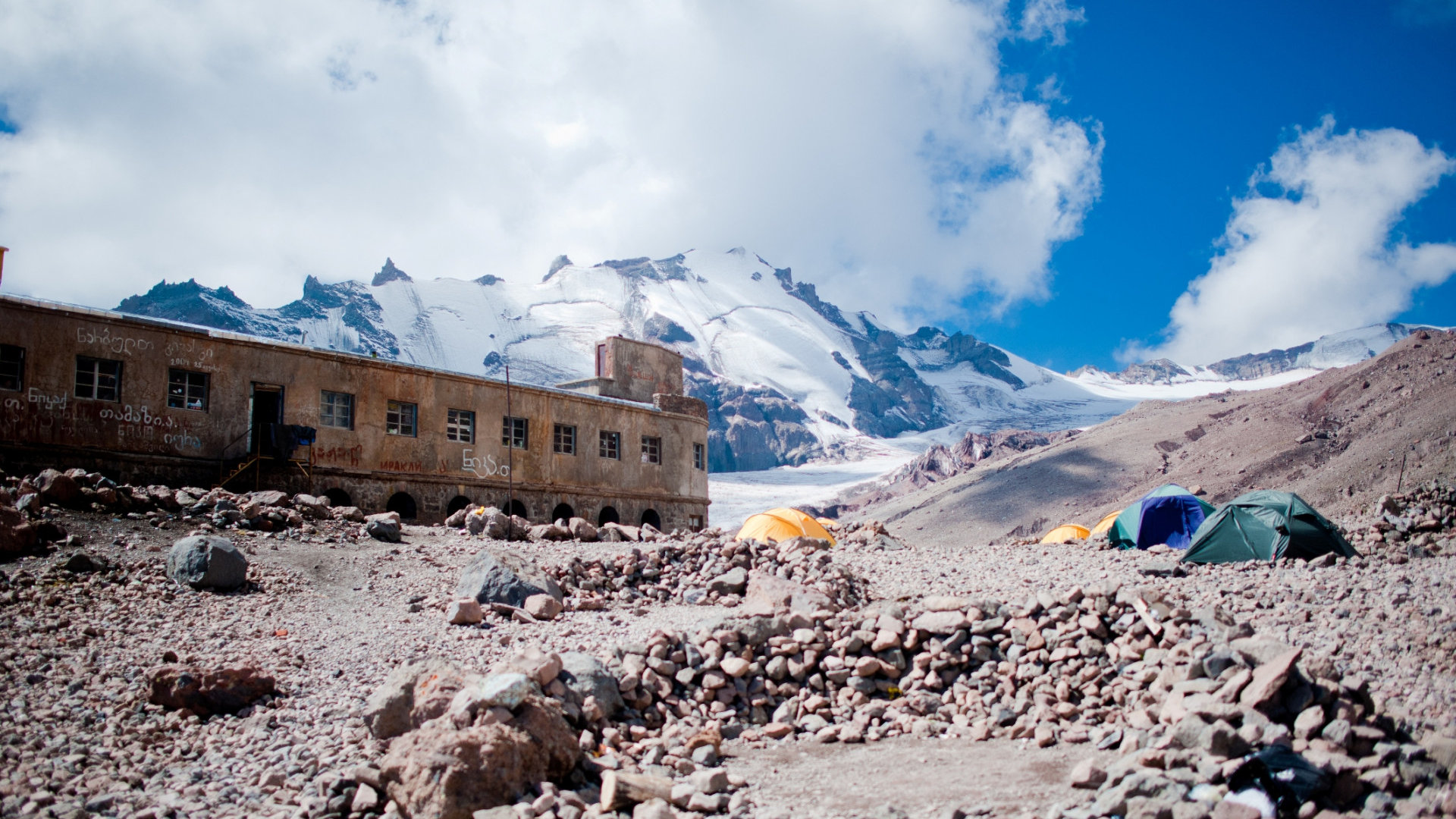 Я была уже хорошо акклиматизирована (с Эльбруса пришла), а Максим нет, он только начал. Поэтому поставили лагерь на метеостанции, а для акклиматизации прошлись вперед по тропе, но сильно высоко не полезли.
