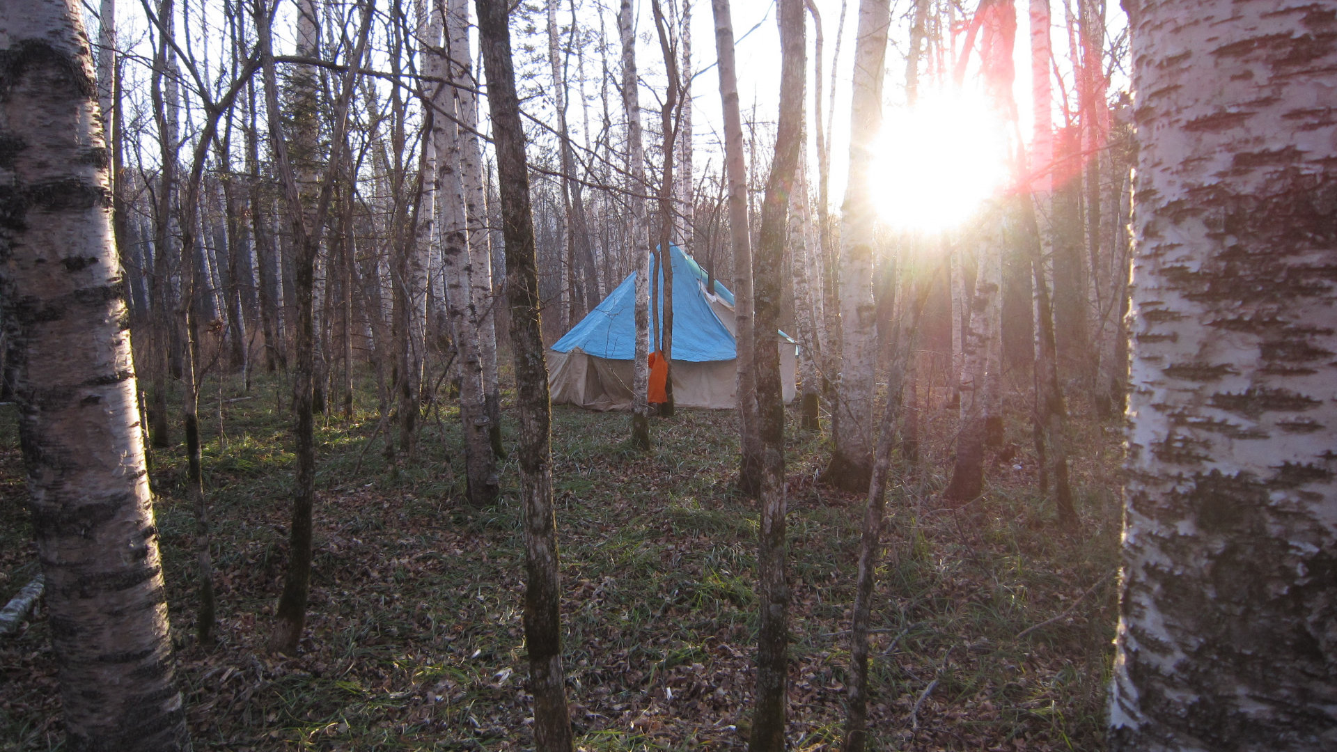 В первый вечер мы успели наготовить дров на все дни, поставить наш шамаханский шатер, сварить ужин и сбегать на сопку проводить солнышко.