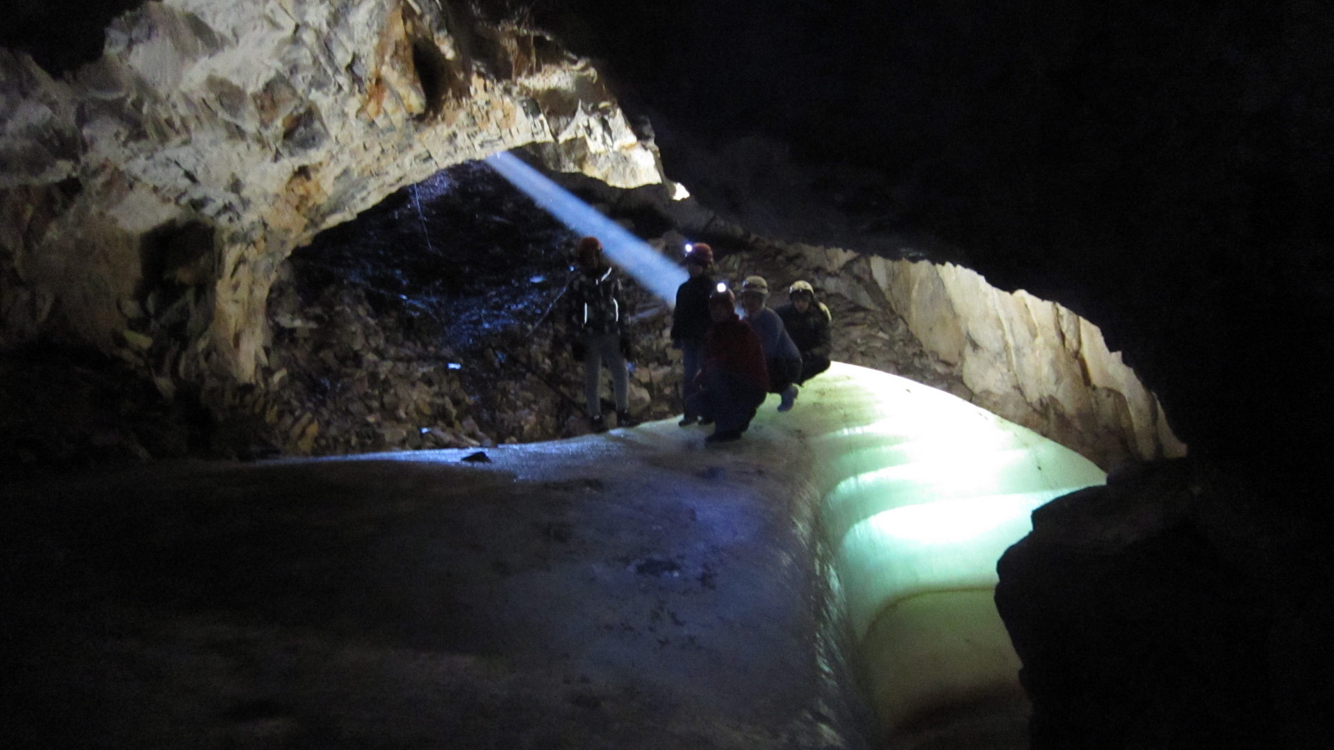 Налюбовались на кристаллы льда на потолке и спустились к узкому лазу в нижний зал между ледником и стеной.