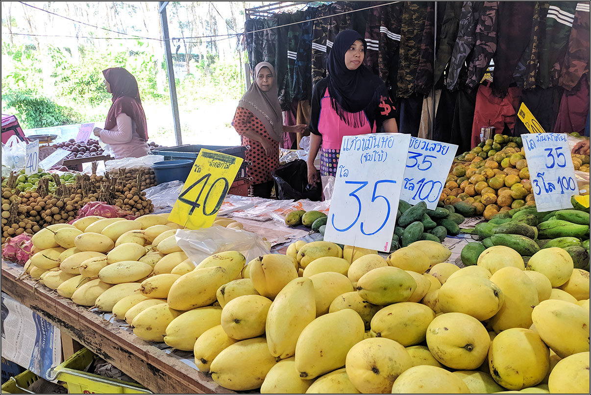 Поехал на местный рынок. Он тут кочующий, по дням недели. Вчера, в четверг, он разместился недалеко от нас, по дороге из Клонг-Муанга в Ао Нанг — это тут два туристических района.Ощущение было такое, что-либо у меня склероз, либо в Таиланде цены опять снизились. Манго стоит 35 бат за килограмм! Это чуть больше доллара! Причем не какое-то там недозрелое, а большие, красивые, желтые плоды. Раньше, кажется, я дешевле 50 бат на рынках его не видел.Ну, про все остальное — смотрите фотографии, там многие с ценниками. Я каждый год слышу жалобы, что в Таиланде стало все дорого, бат дорожает и т. д. Бат действительно дорожает, еще недавно 1 доллар стоил 32 бата, сейчас уже 30. Но стоимость всяких бытовых вещей здесь все равно настолько низкая, что с Россией не сравнить. Хотя, конечно, это относится только к тем, кто здесь живет долго, и сам ведет какое-то хозяйство. Если питаться в туристических ресторанах — действительно будет казаться, что все дорого.