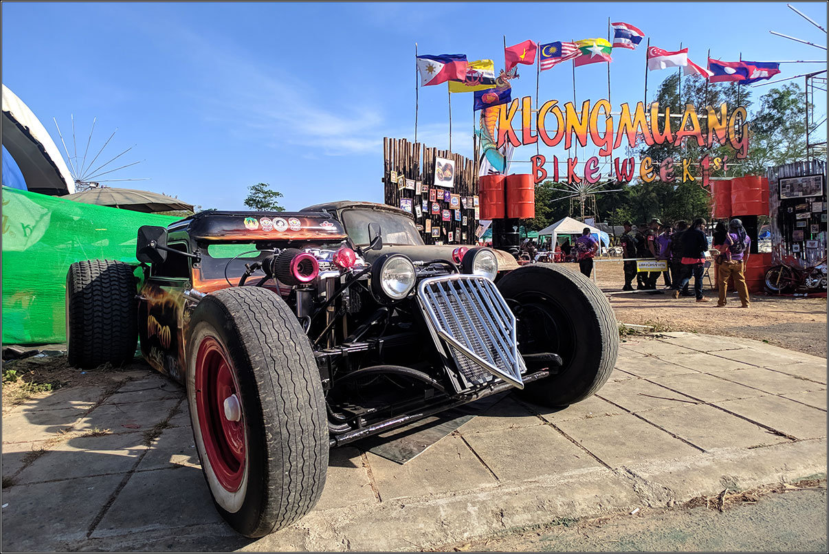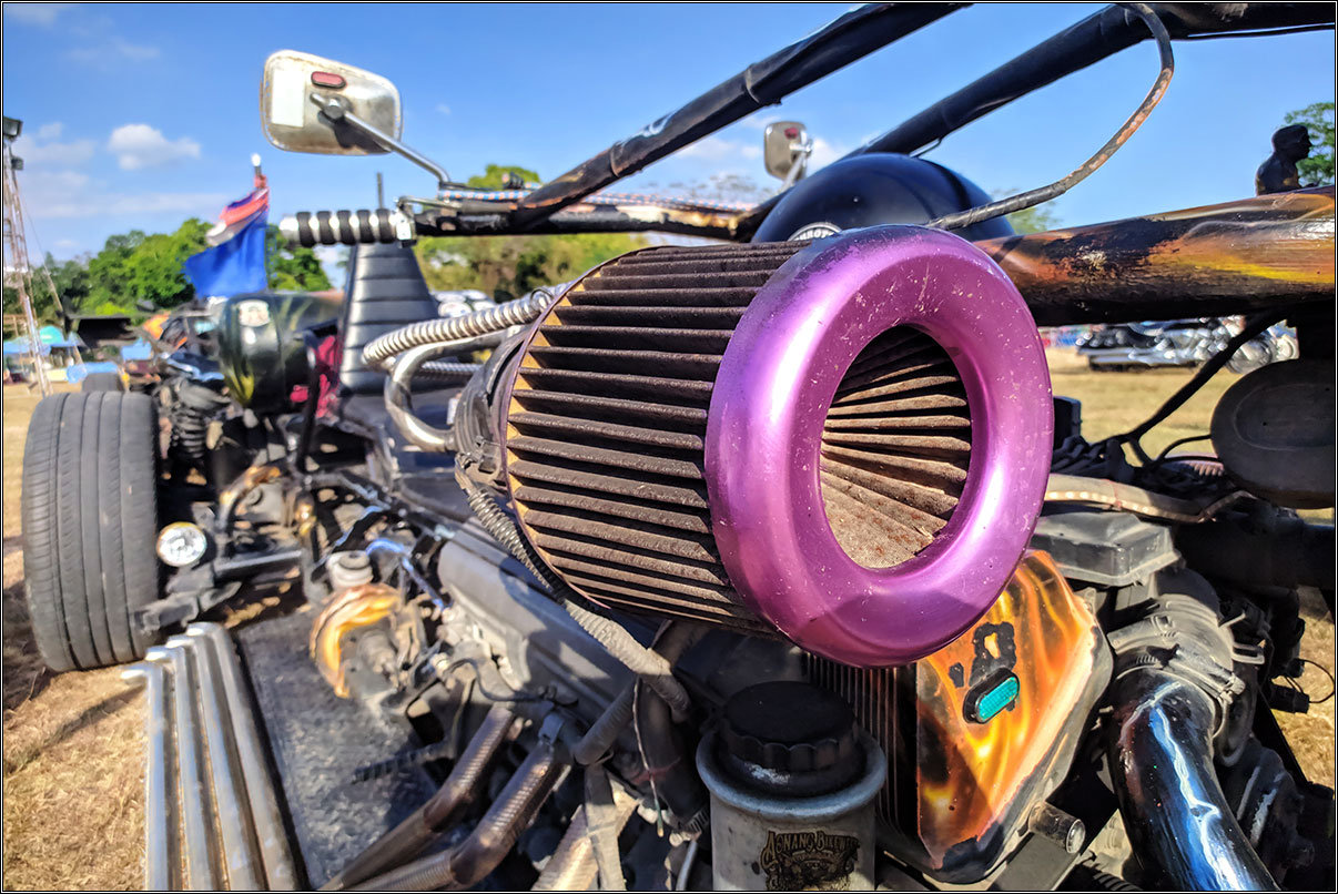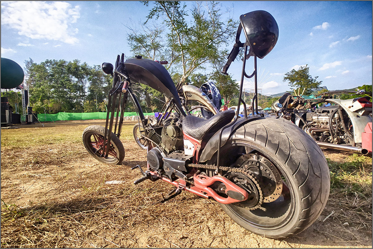 Выглядит впечатляюще, хотя, конечно, это в массе своей уже не средства передвижения, а мотоциклетный haute couture — выглядит круто, но для передвижения не очень подходит. Ну так на то и выставка.Особенно жалко тайцев, которые одеты как положено байкерам — все в коже, заклепках, жилетках, и куртках с нашивками и наклейками. В +30 под ярким солнцем. Сидят, пьют пиво и мужественно потеют :)