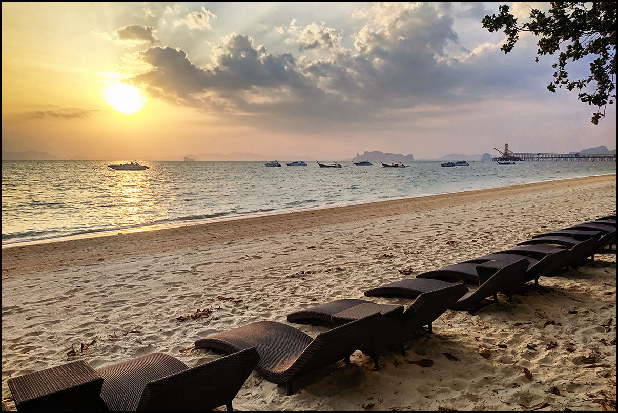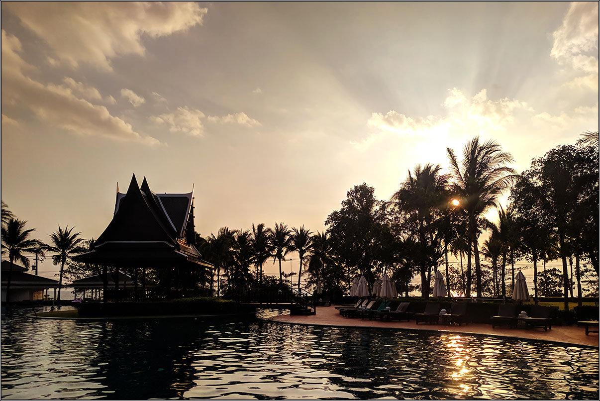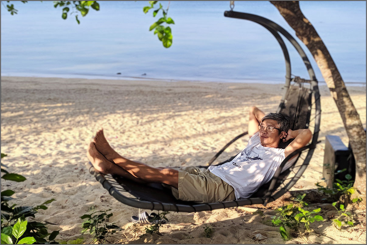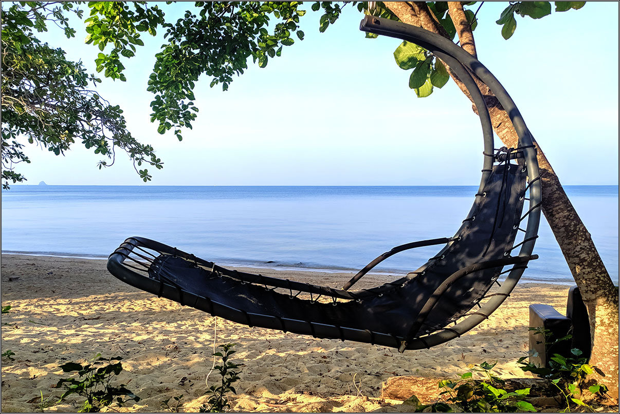 Тут есть маленький пляжик, который находится у резиденции принцессы Таиланда, там обычно тихо, спокойно и море красивое. Приехали туда сегодня прямо на рассвете, и вот — пожалуйста. Море тихое, вода прозрачная, людей вообще нет, даже тайцев в местном кафе. Красота и спокойствие, гамаки, диванчики, и очередные кустарные артобъекты какие-то вокруг.