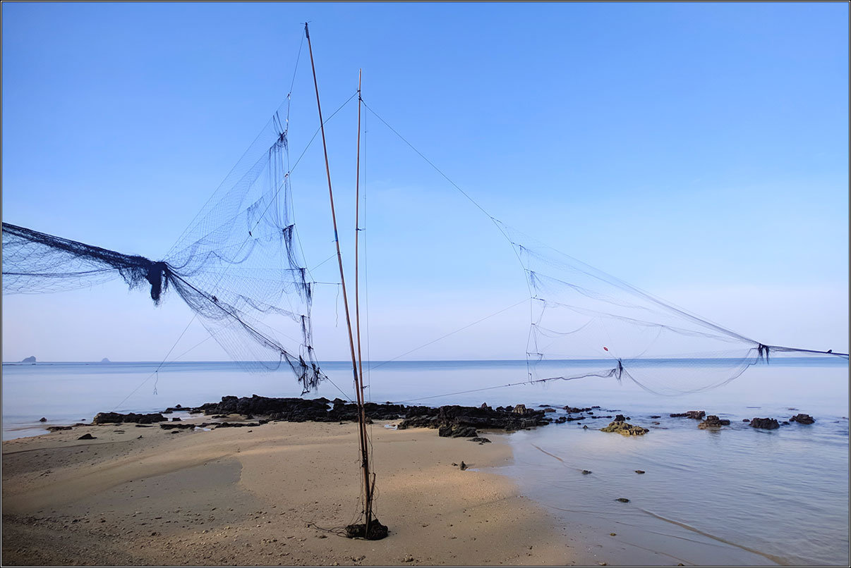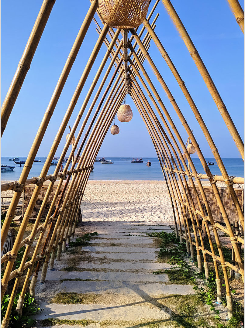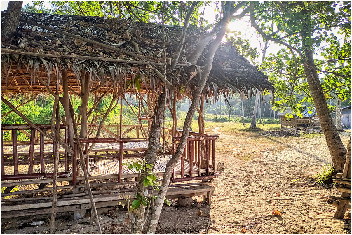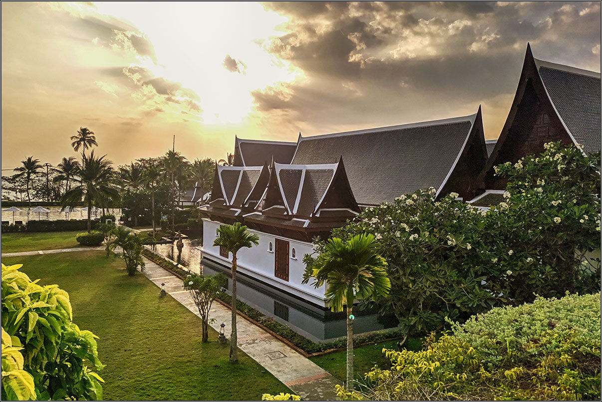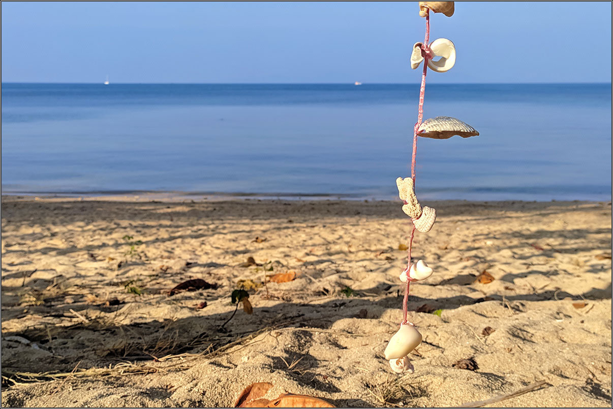 Тут есть маленький пляжик, который находится у резиденции принцессы Таиланда, там обычно тихо, спокойно и море красивое. Приехали туда сегодня прямо на рассвете, и вот — пожалуйста. Море тихое, вода прозрачная, людей вообще нет, даже тайцев в местном кафе. Красота и спокойствие, гамаки, диванчики, и очередные кустарные артобъекты какие-то вокруг.