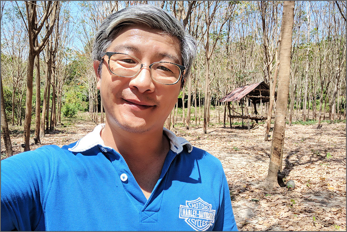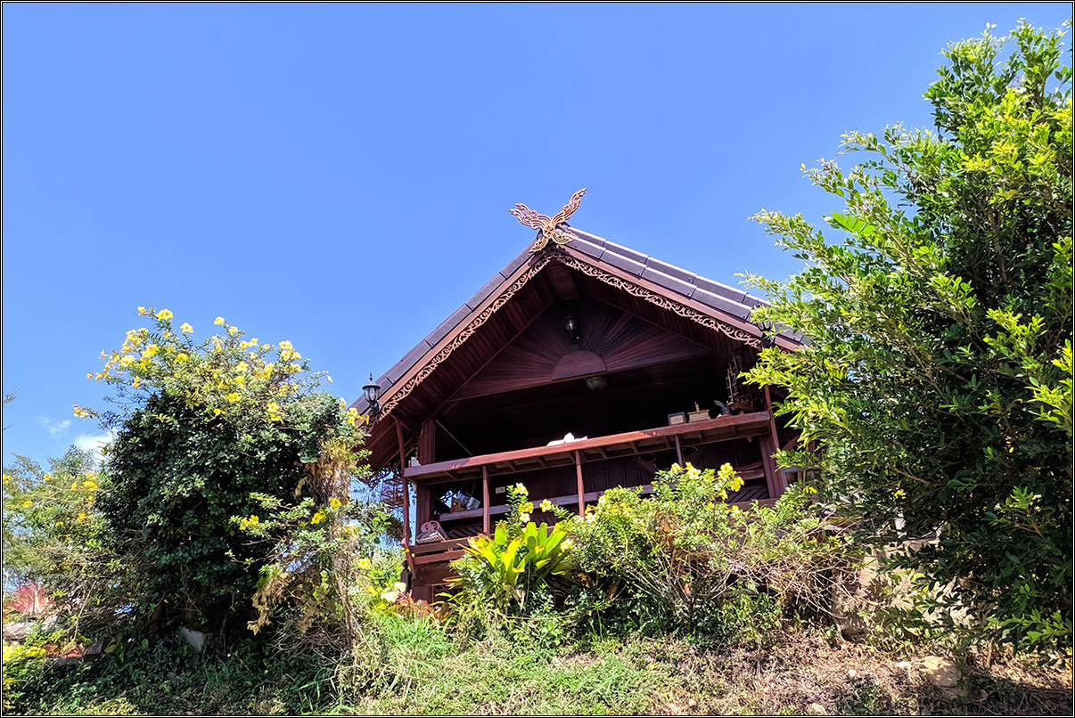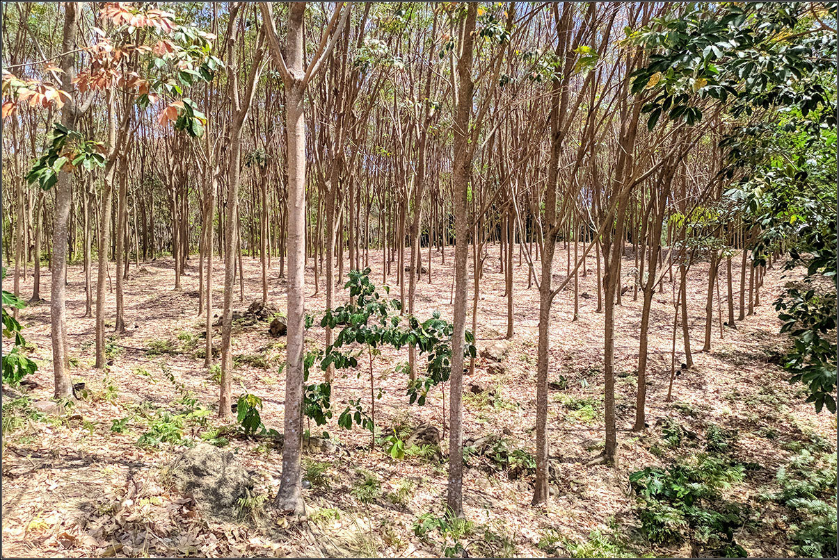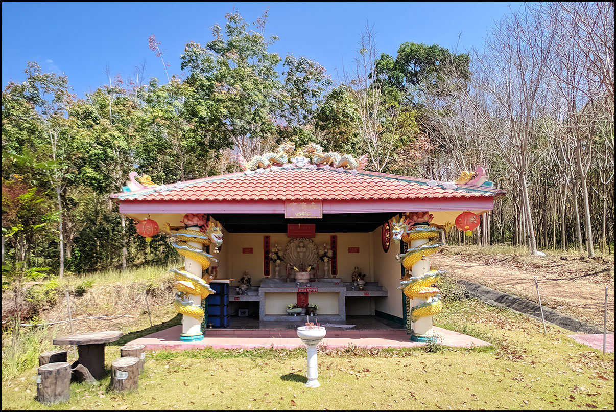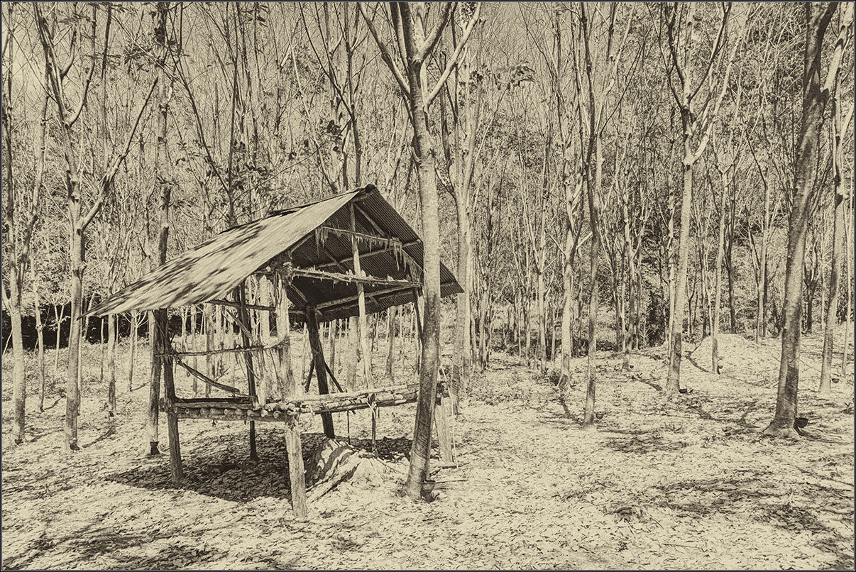Вокруг храма — ровные ряды каучуковых плантаций. Дорога уходила куда-то вглубь, и я поехал дальше. Впрочем, там уже почти ничего не было, только в самом конце, когда последние следы тропинки исчезли в опавшей листве, обнаружилась эдакая почти сказочная избушка на курьих ножках — навес для отдыха сборщиков каучука.
