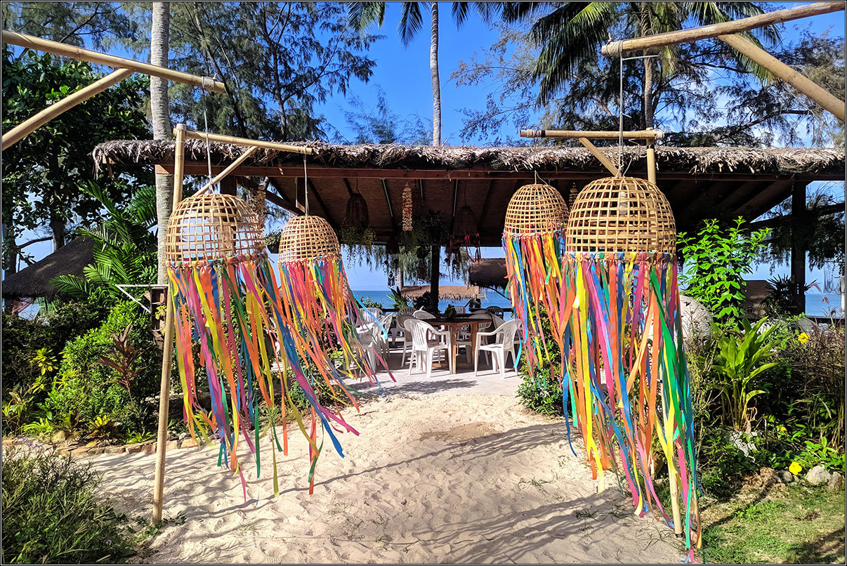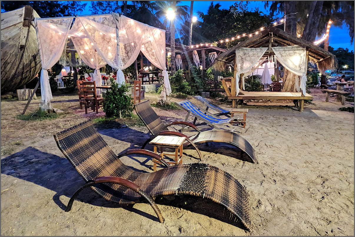 Раньше тут был большой пустырь, на котором стояли большие лодки, невесть как попавшие сюда с Меконга. Я тут учил кого-то байк водить, потом фотографировал семейство, то есть место знакомое. А сейчас мы тут обнаружили кафе, которое вот прямо все состоит из разных локаций. Тут навес со столиками, тут чиллаут с циновками, здесь гамак под крышей, вот вам стойка бара с видом на море, а вот тут вид на море через задницу соломенного коня :)