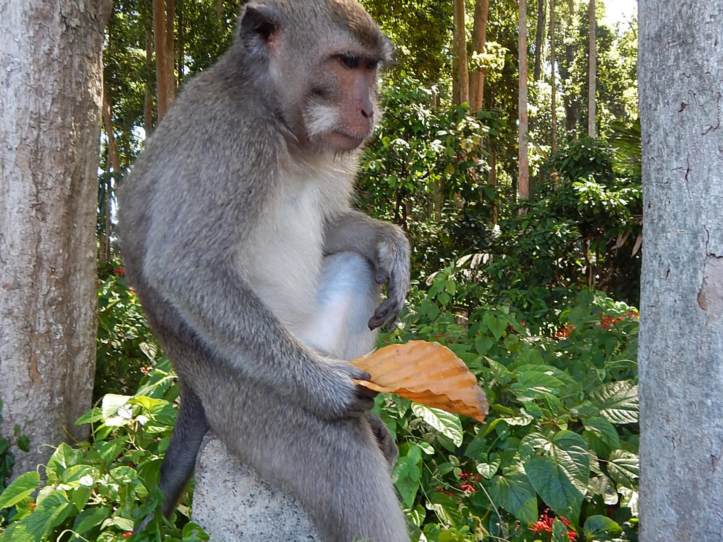 У меня с собой был только фрукт из моего сада, похожий на яблоко. Местные называют его джамбу. Короче, взяла я «яблоко» для Вали, но увидев протянутую лапку обезьяны, не выдержала- отдала.