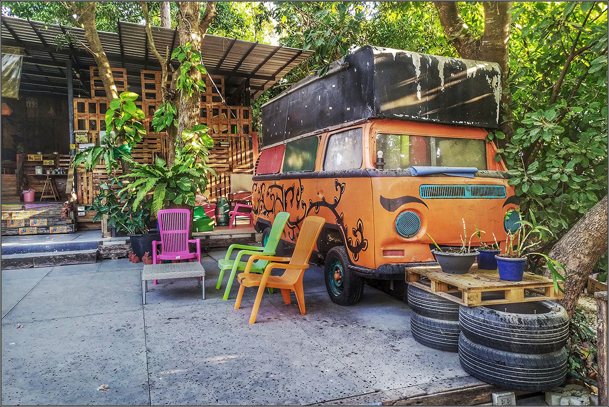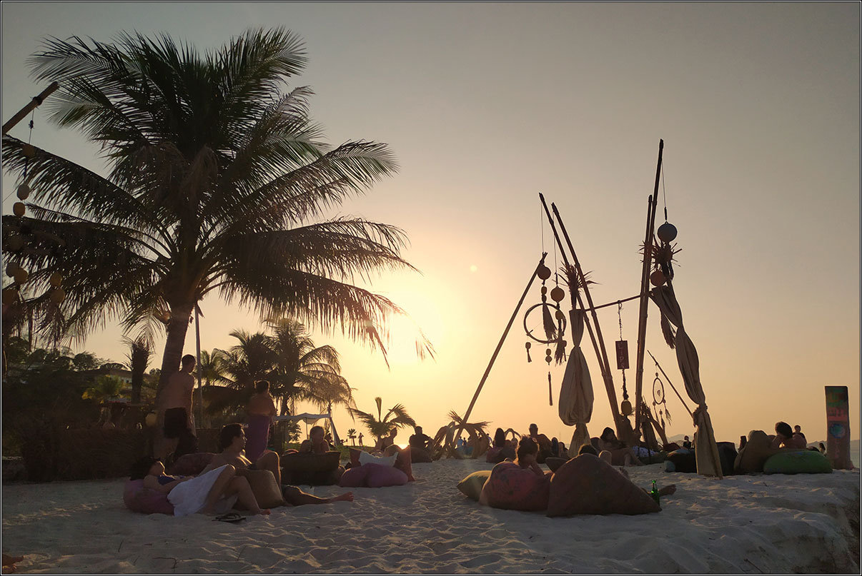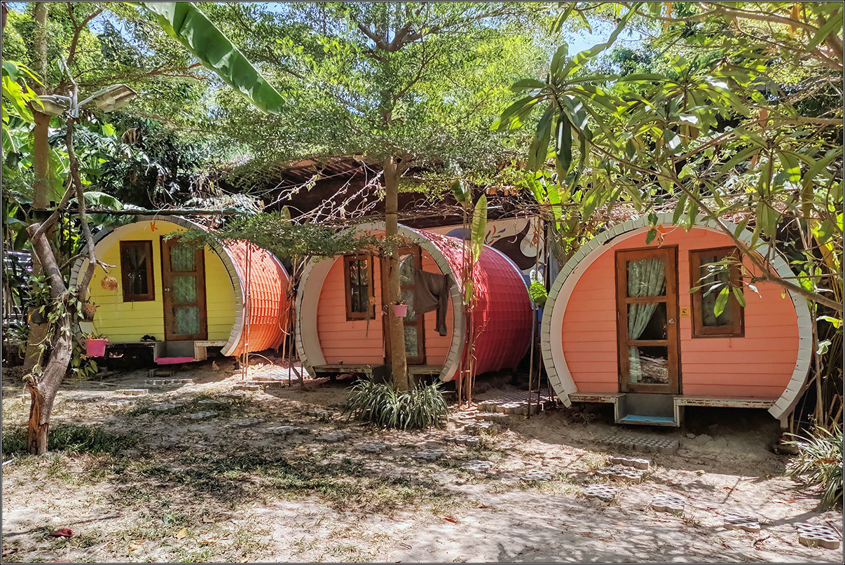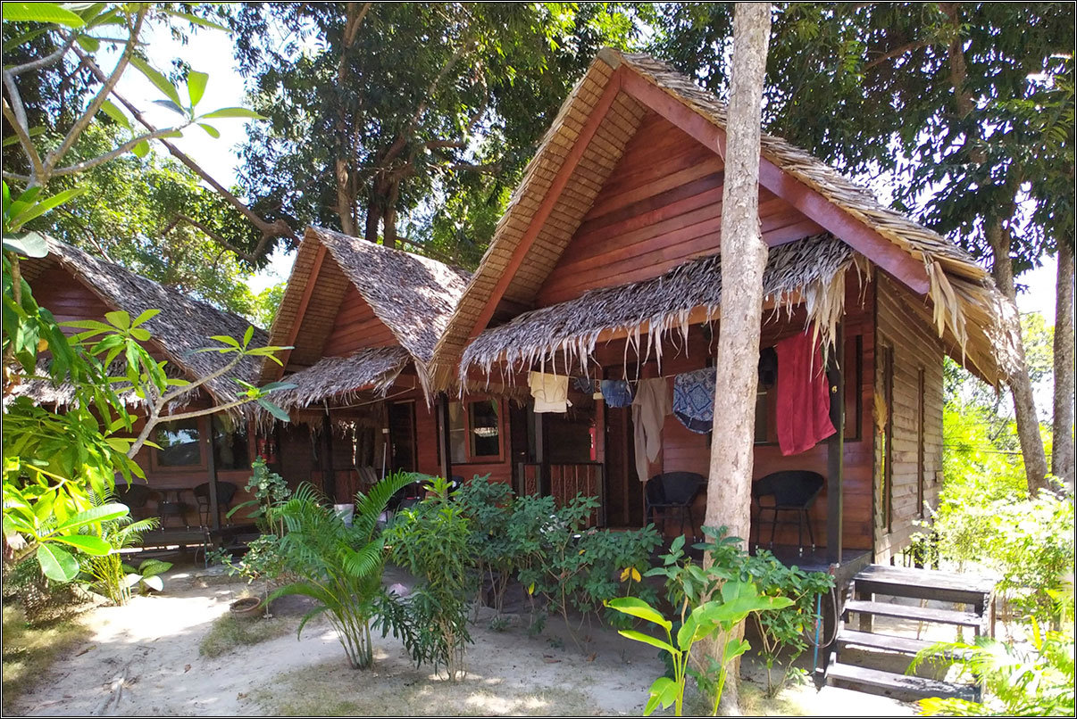 Последний раз мы были здесь семь лет назад, в 2013 году. Приехали с Лангкави поздним паромом, долго бегали по острову в поисках жилья, все было занято, в итоге нас, уже отчаявшихся что-то найти, подхватил в кафе местный художник Джо и сдал нам палатку за 200 бат в своей мастерской.Дабы избежать в этот раз подобных приключений, мы забронировали жилье заранее. Ко Липе — остров расслабленного пляжного отдыха, там домой приходишь только ночевать, так что мы выбрали даже не отель, а хостел — душ-туалет во дворе, в номере только пара матрасов и вентилятор, зато сам хостел прикольный: круглые домики на тенистой полянке ровно посередине острова.Не прогадали, кстати: в домиках этих было не жарко даже днем, от дороги они далеко и проезжающие байки и тук-туки не мешали спать. Правда, заявленный на Агоде включенный завтрак оказался представлен исключительно пакетиками кофе 3-in-1 и кипятком, ну да и фиг с ним. Зато цена домика составляла 500 бат в сутки, что для Ко Липе — практически даром.