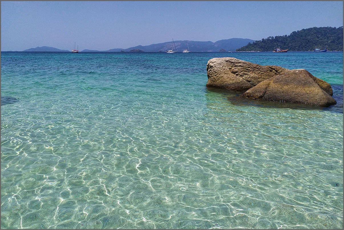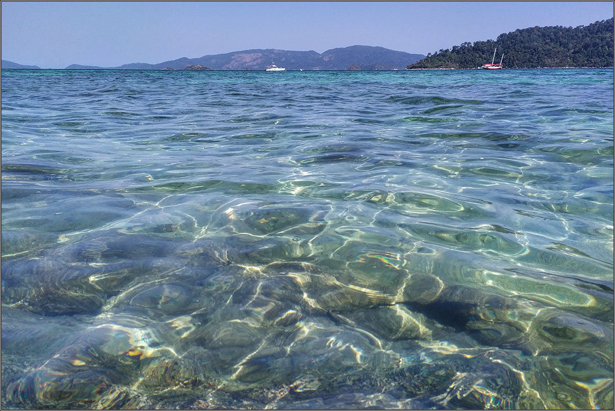 Море на Ко Липе чуть другого оттенка, более зеленое, поскольку песок все-таки не настолько белоснежный, как на Мальдивах. Но при этом прозрачность воды — ничуть не уступает. На Ко Липе точно так же отличный снорклинг прямо с берега. Черепахи и манты, правда, не водятся, но всяких рыбок и кораллов хватает, и залипнуть с маской и трубкой в воде можно надолго.