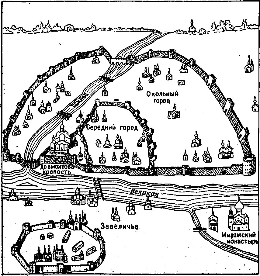 В верхнем течении и в устье реки Псковы опускались решетки (хорошо просматривается на плане) и гавань Кремля становилась недоступной.