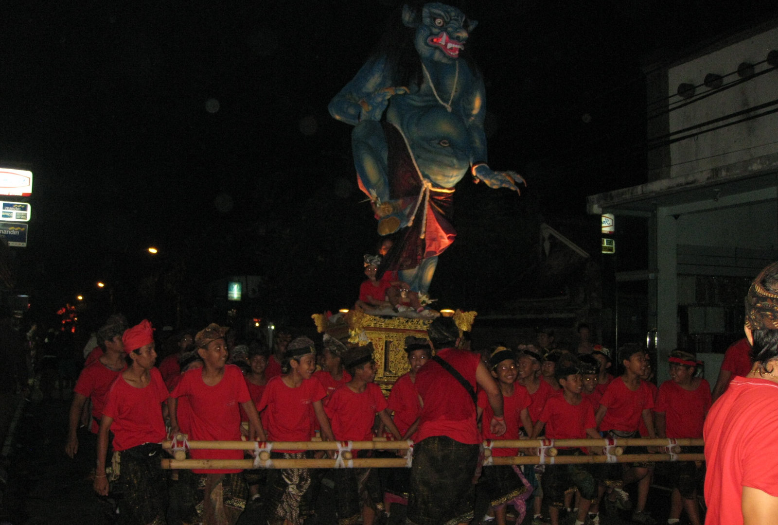 Площади и улицы городов заполняются народом-все хотят увидеть Чудовищ. Ого-Ого проносят на сбитых из бамбука носилках. Каждое Чудовище народ встречает громкими воплями восторга и улюлюканьем. Потом его начинают раскручивать на носилках-для устрашения и для того, чтобы показать, как же искусно его сделали. Некоторые Ого-Ого настолько огромны, что могут задеть за провода, поэтому провода поднимают специальными палками-тогда и проносят под ними чудовищ. Потом Ого-Ого сжигают на пляжах или просто топят в океане. Вместе со злыми духами в них. А на следующий день с шести утра Остров погружается в тишину на сутки-наступает День Тишины. Нельзя зажигать свет, разводить огонь, работать, шуметь, выходить на улицу. Даже аэропорт не работает. По улицам ходят патрульные, а если заметят нарушителя, то тому несдобровать.