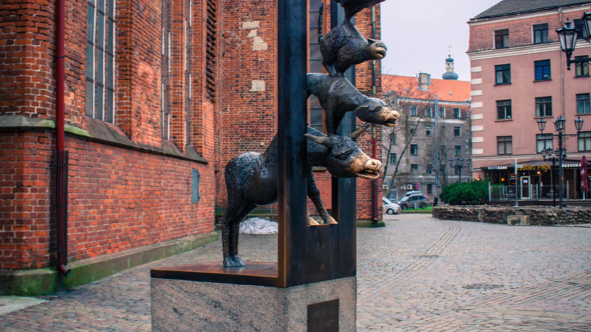 Оббегая св. Петра мы неожиданно вырулили к памятнику Бременским музыкантам. К нему стояла очередь страждущих загадать желание. Как связаны Рига и Бременские музыканты, подумали мы ( и где же, где эта Ратушная площадь?). Оказывается вполне себе историческая. Этот памятник подарил городу в 1990 году город-побратим Бремен, из которого в далеком 1200 году прибыл в эти земли основатель Риги епископ Альберт. Так что три те носы животинкам и да сбудутся ваши желания.