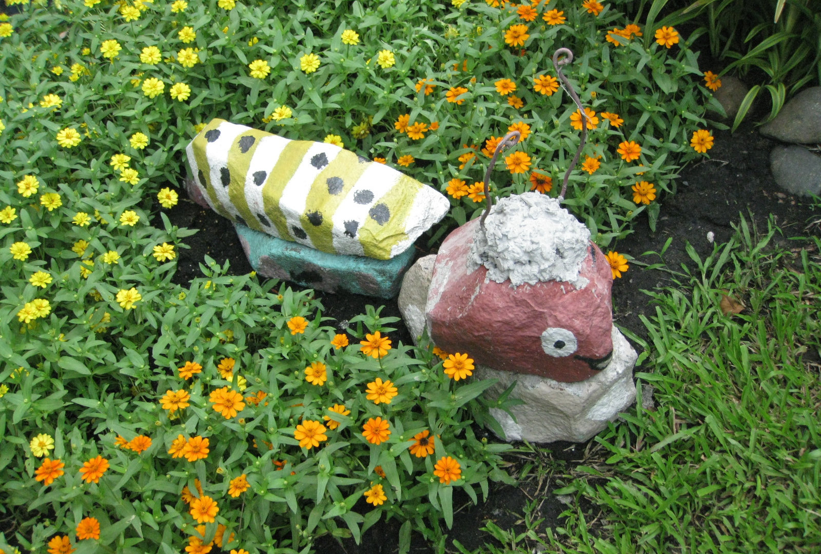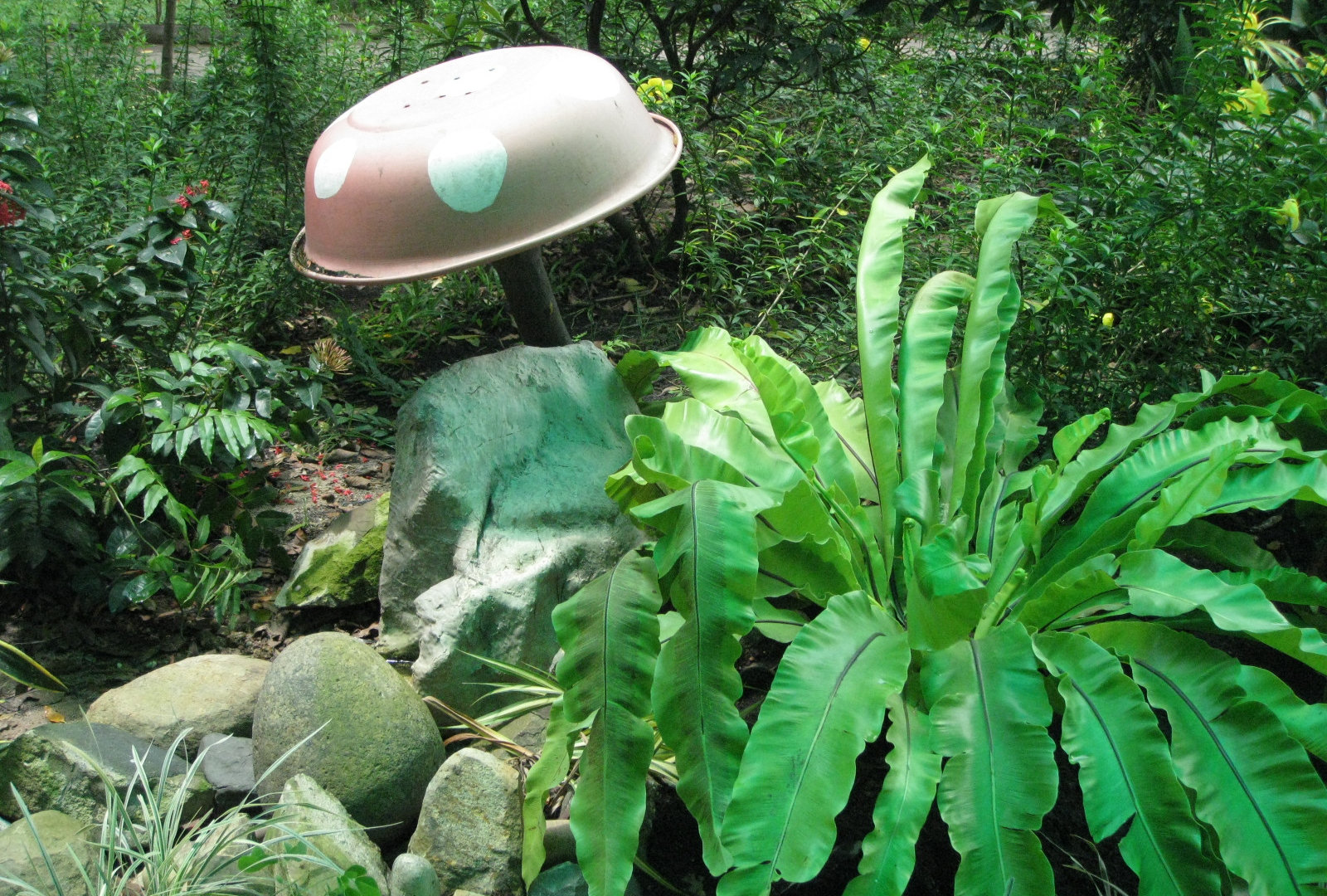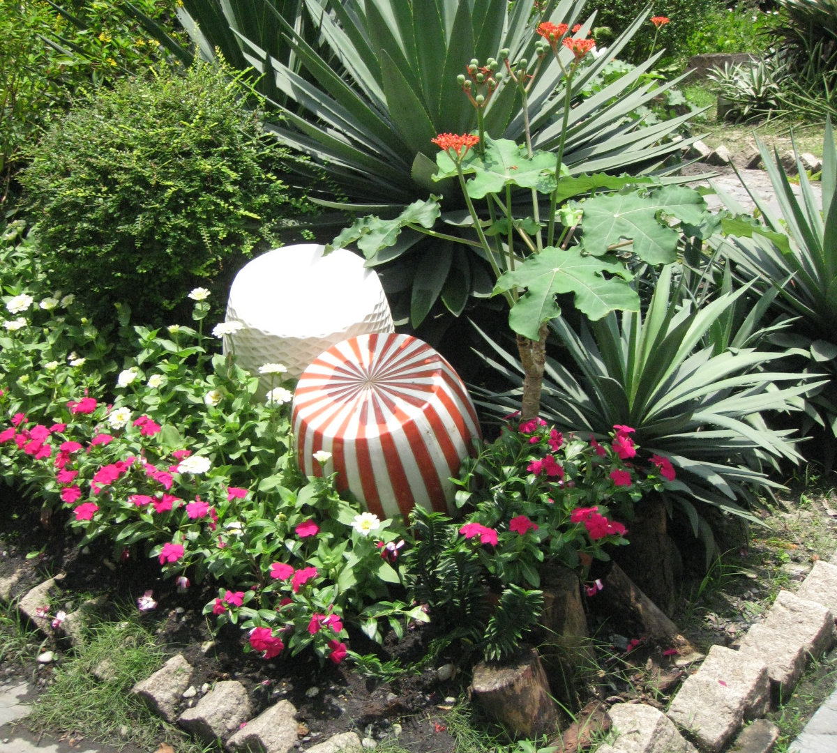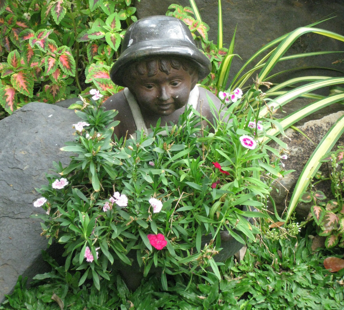 И вот оборотная сторона медали... Такое ощущение, что здесь подрабатывает чокнутая бабка из соседнего подъезда:( Грибок из старого таза, уродливо раскрашенные камни и какающий на клумбе мальчик....