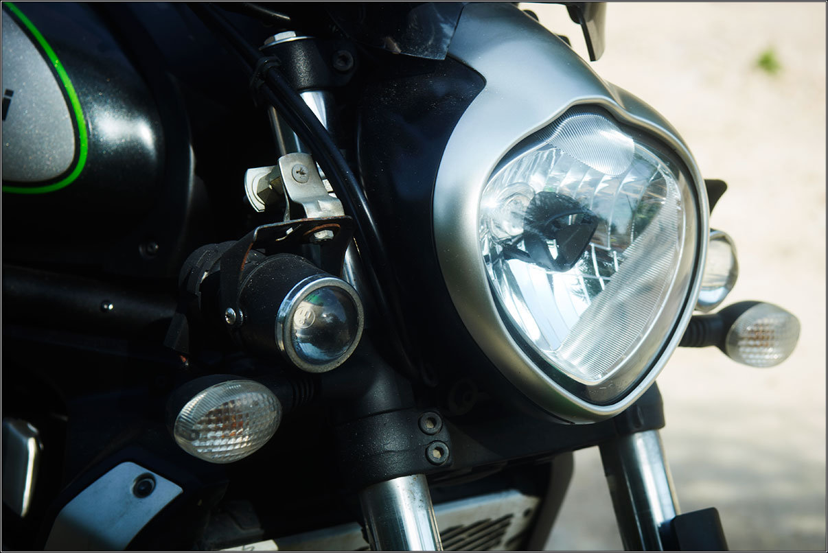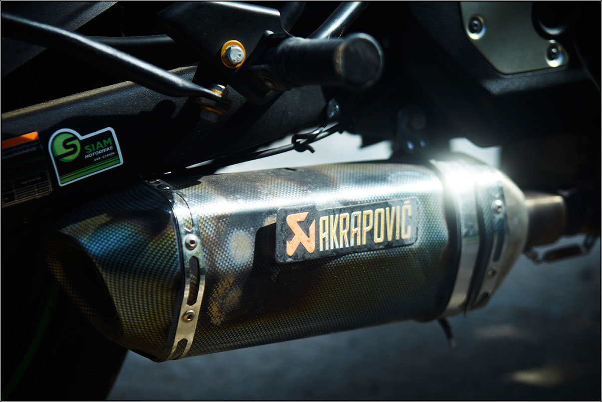 Вот, этот Вулкан: 650 кубов, 230 кг веса, и тюнингованный с носа до хвоста. Модный дорогой выхлоп «Akrapovic», очень громкий и крутой, вся труба в карбоне. Тонированное ветровое стекло.