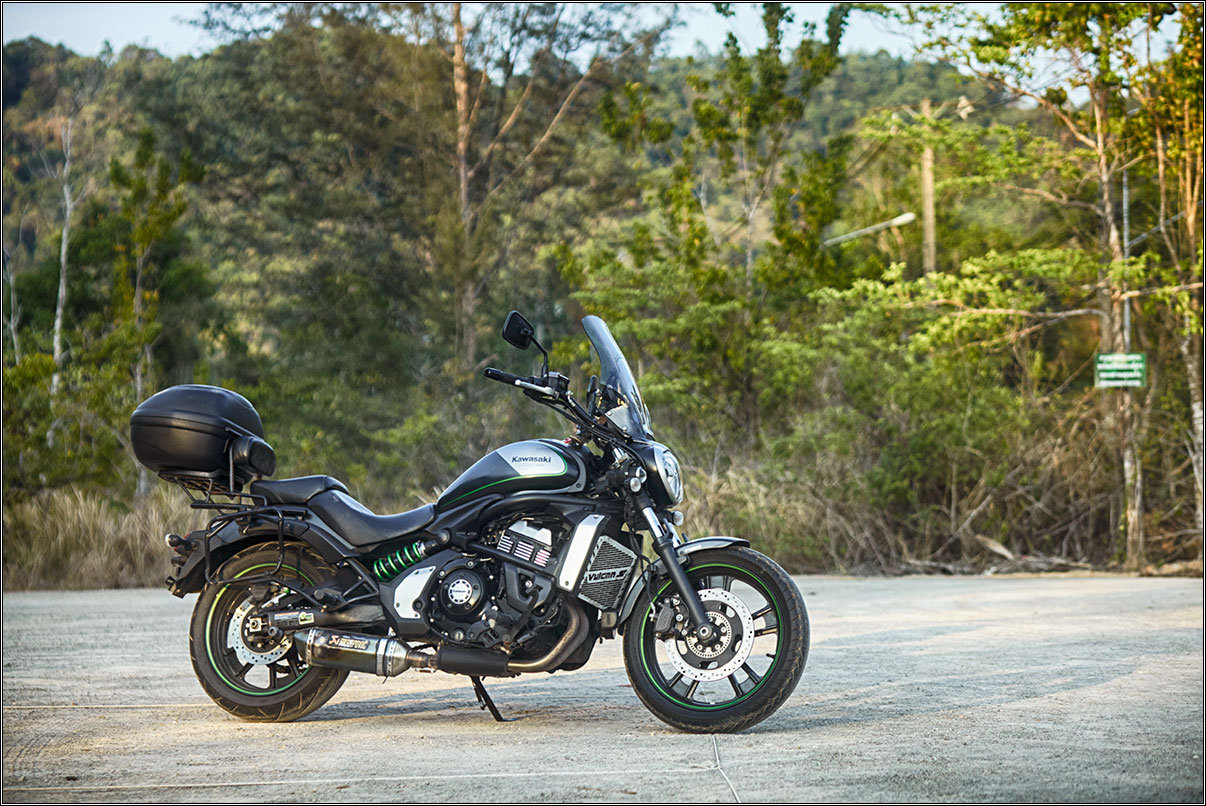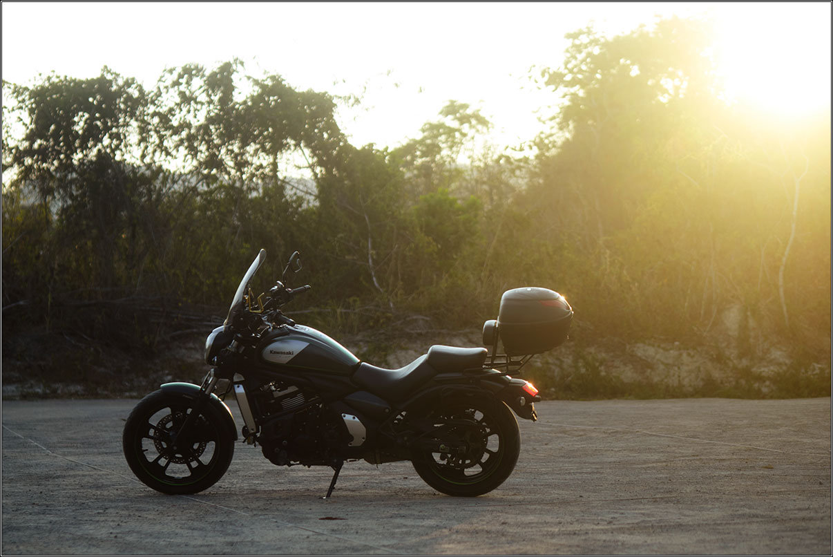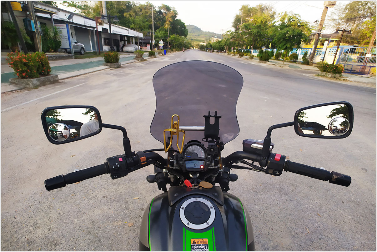 Всякие подстаканники, держалки для смартфона, спинка для пассажира и дуги для кофров. Очень все нарядно и красиво. Ну и мощь, конечно, чувствуется, 650 кубов — это вполне серьезно. Если ручкой газа крутануть, он прыгает вперед как подорванный, надо аккуратненько, чтобы не пугать пассажирку. Конечно, на каждый день такой мотоцикл тут не нужен. Ну просто неудобно каждый раз, когда у тебя кончились рис и макароны, ворочать этот здоровенный Вулкан. Но вот держать его вторым во дворе под навесом, полировать тряпочкой, а на выходные выезжать на нем куда-нибудь в красивые места — милое дело :)